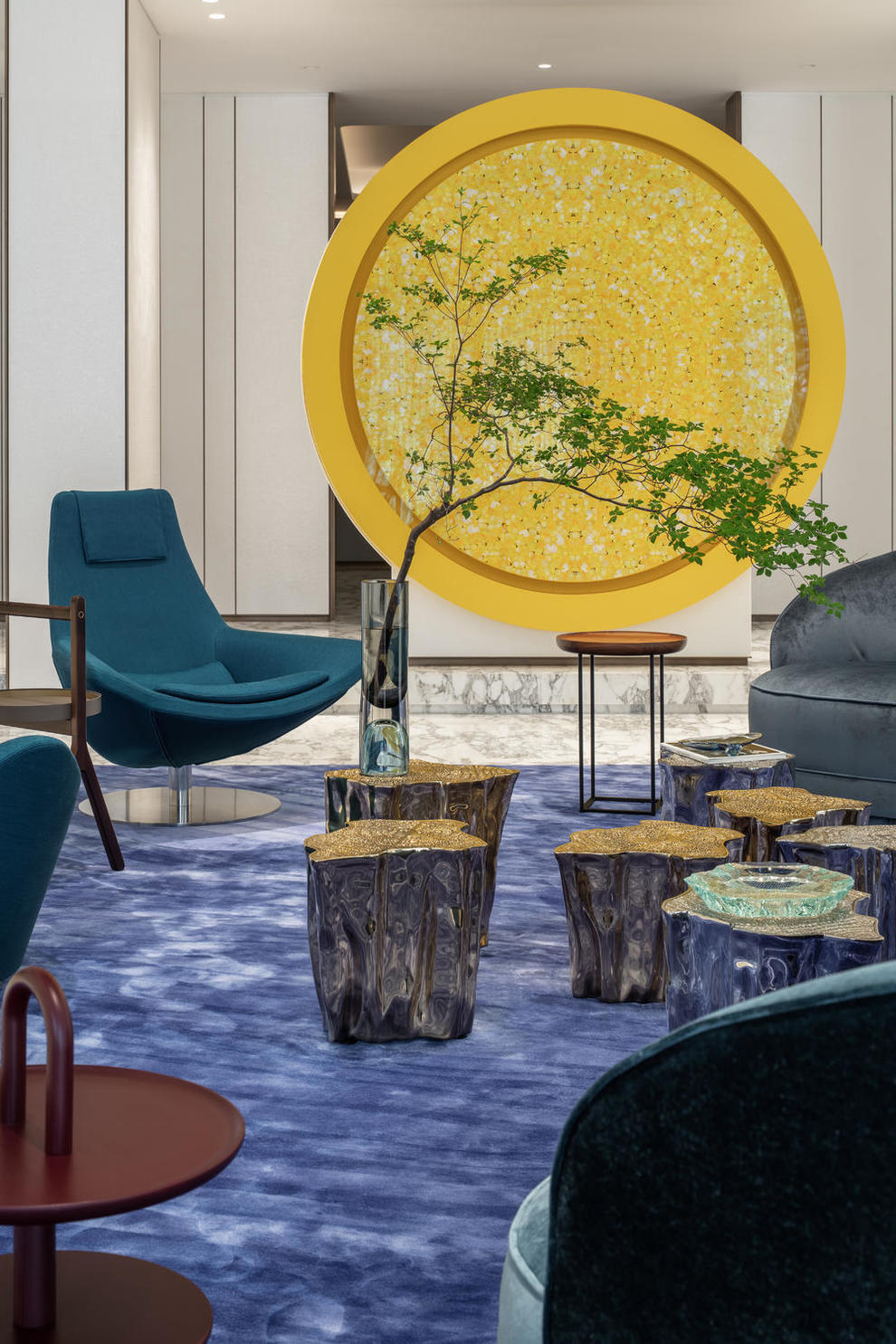 达米恩·赫斯特的《黄蝴蝶》画作,独立于客厅一侧,观照于整个空间。同时作为一道通向电梯厅的照壁,突破了视觉的构图,让整个空间在端庄中增添了一份活力,别有意趣。