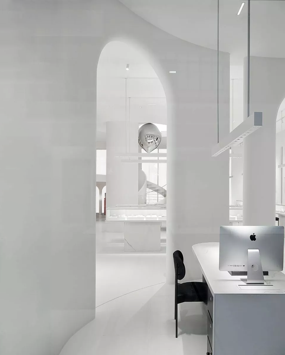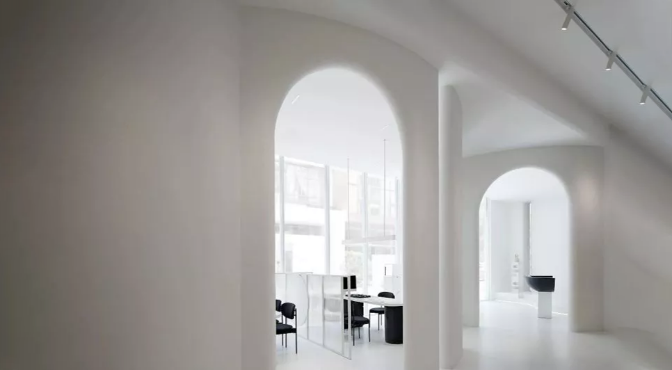 空间融合的首要是统一空间形态语汇,我们应用圆,拱形,曲线等作为的设计语言,在空间中寻求表达。设计中我希望空间与人要能产生互动关联,通过设计引导产生关联,所以空间中我们也融入一些其他装置来烘托空间的氛围。它正好位于空间的入口处,无论是消费者或是是路人,都可以引导至此,做一个网红打卡,形成人与空间的互动,同时也可以通过互联网传播,以达到品牌的曝光度与识别度。