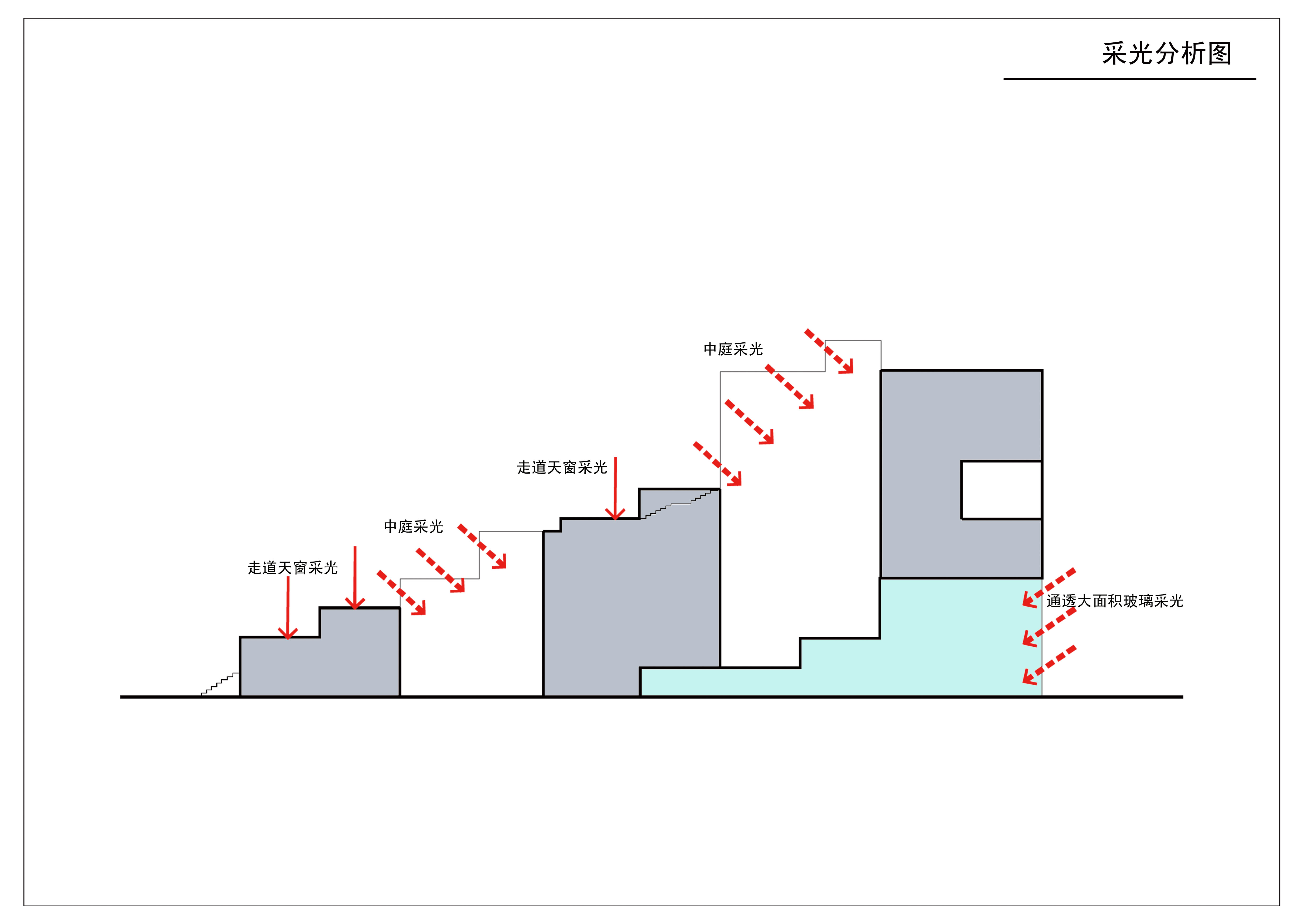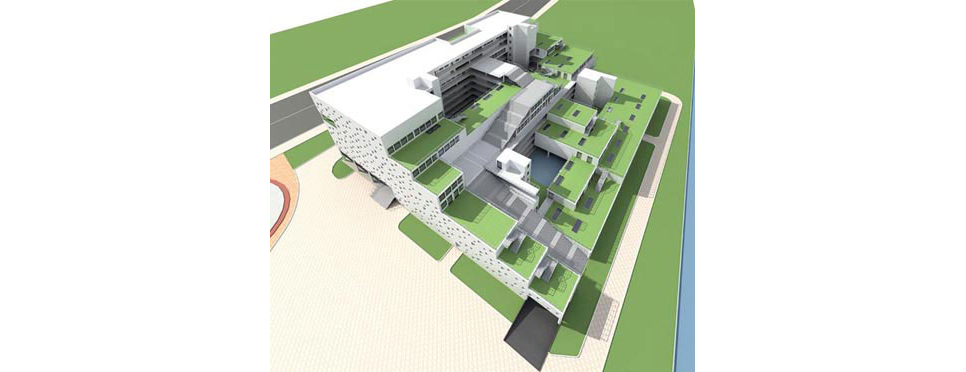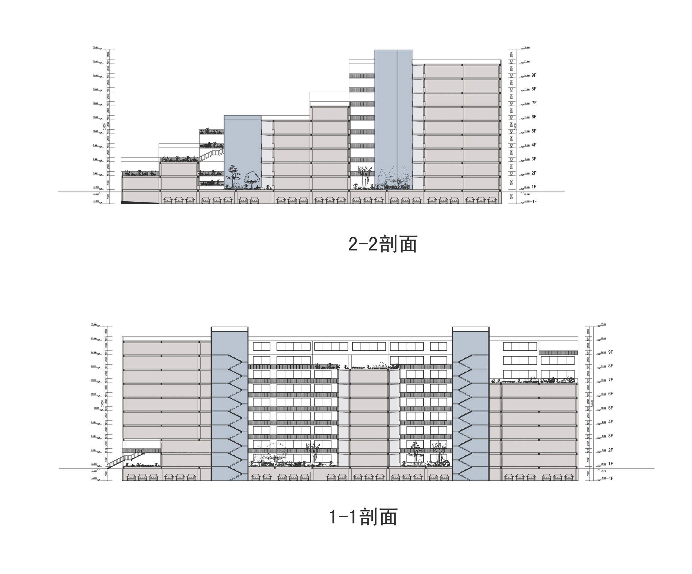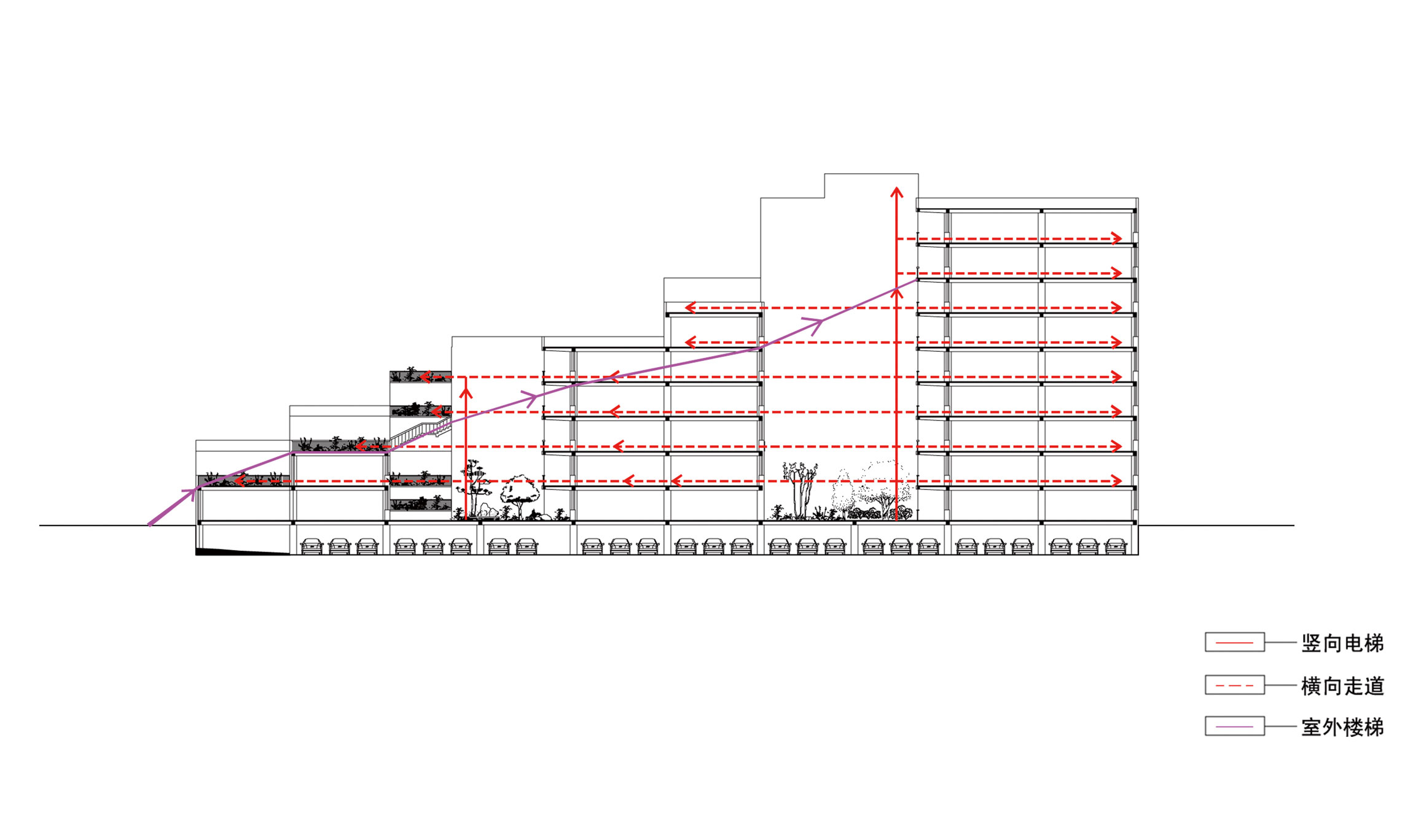 Landscape is not just a landscape, stairs are not just the construction of transportation, they are an integral part of the building facade. At the same time, energy-saving measures such as roof greening, rainwater collection, and solar power generation will be set up. Simple blocks are used to form a well arranged space, and roof garden is connected with elevators through large and small stairs. Setting up four courtyards can allow more space to be directly naturally lit. At the same time, some indoor corridors have skylights at the top for natural lighting. Plants, as decorations for buildings, not only enrich the facade but also create a good office environment, and are also environmentally friendly and energy-saving.