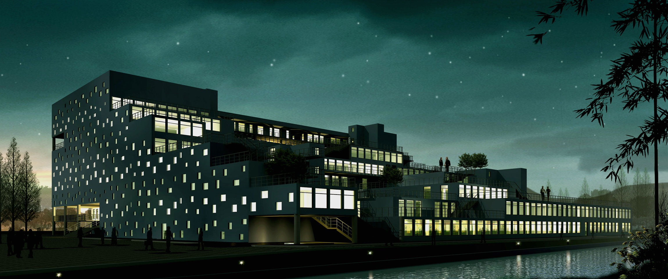 Brief introduction: main road on the north, wide river on the south, and good view from the south. First we analysed with the forms, make sure not to block each others and connected in the same time. Rooms, corridors, roof, stairways all become an organic body. Office space get the daylight from the south and courtyard, and the corridors from the sky. Every office space has independent roof garden, and shared gardens. All the gardens are connected by stairways, in order for the communication. In this way the garden and the stairway become part of the façade. Meantime, green roof, rainwater collection, solar power facilities were used.