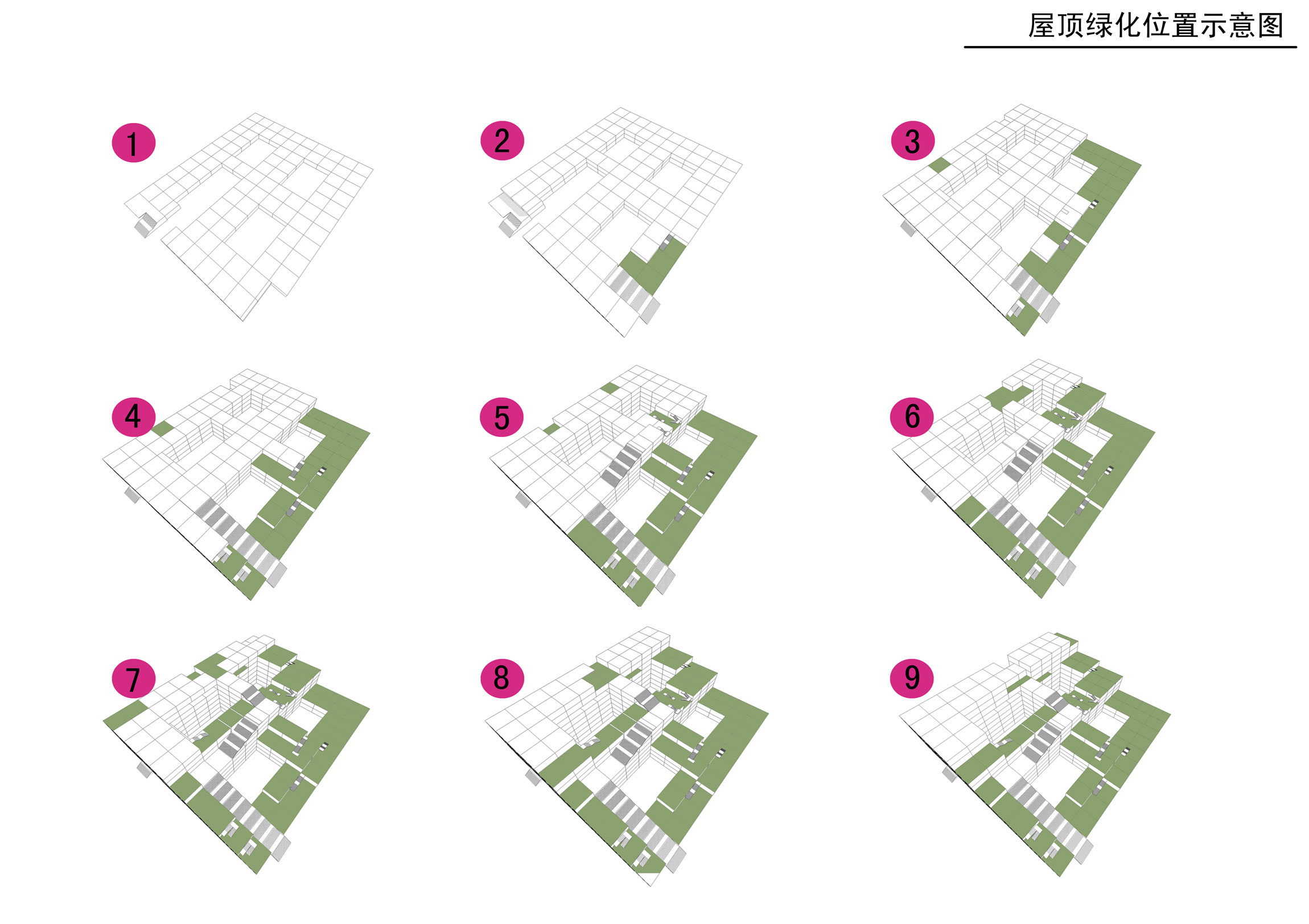 景观不单单是景观,楼梯不单单是交通的构建,他是建筑立面的组成部分。同时设置屋顶绿化、雨水收集、太阳能发电等节能措施。采用简单方块组成错落有致的空间,屋顶花园通过大小楼梯和电梯连贯。设置四个庭院,可以让更多的空间直接自然采光。同时有些室内走廊在顶部设置天窗可以自然采光。植物作为建筑的装饰,既丰富了立面又营造良好的办公环境,也环保节能。