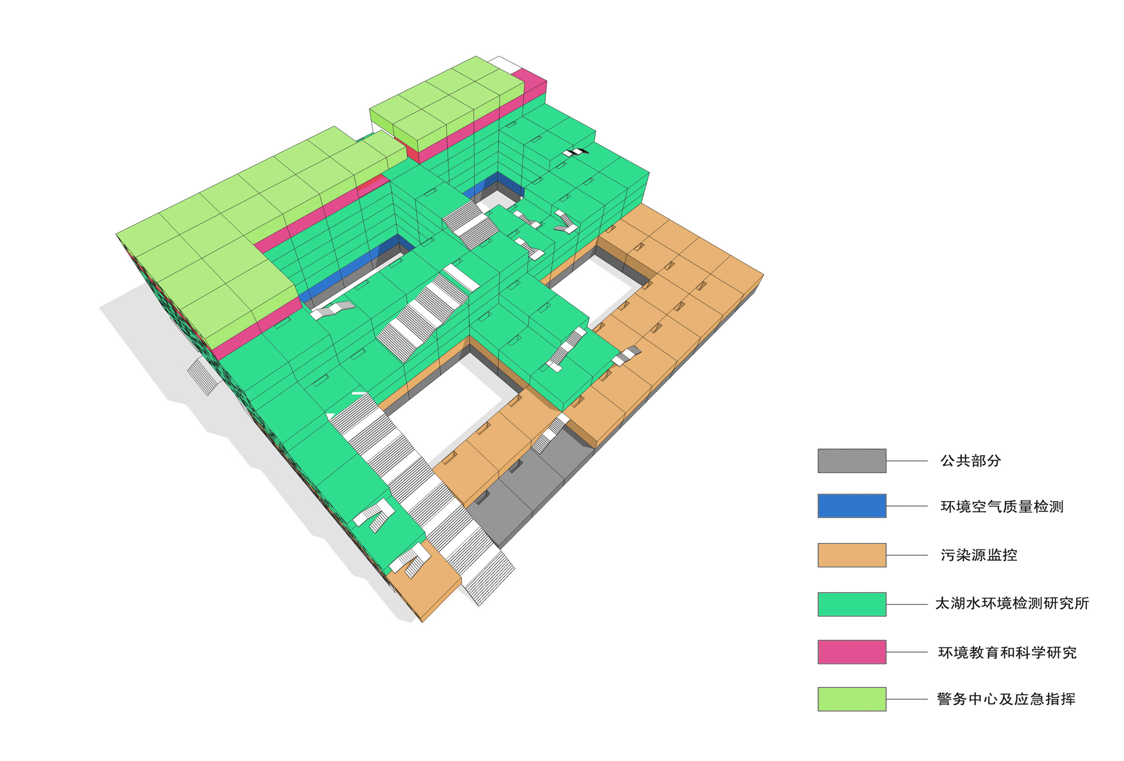 本项目建设地点为为滨湖区太湖新城南湖大道以西、周新路和大通路之间。此项目北面是主干道,南面是一条宽阔河流,南面景观朝向非常好。办公空间南面直接采光和中庭采光,走道采用天窗自然采光。每个办公空间有自己相对独立的屋顶花园,和一些公共的花园。同时每个屋顶花园通过大小楼梯连通在一起,方便交流。