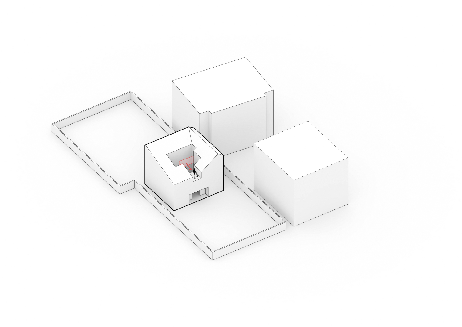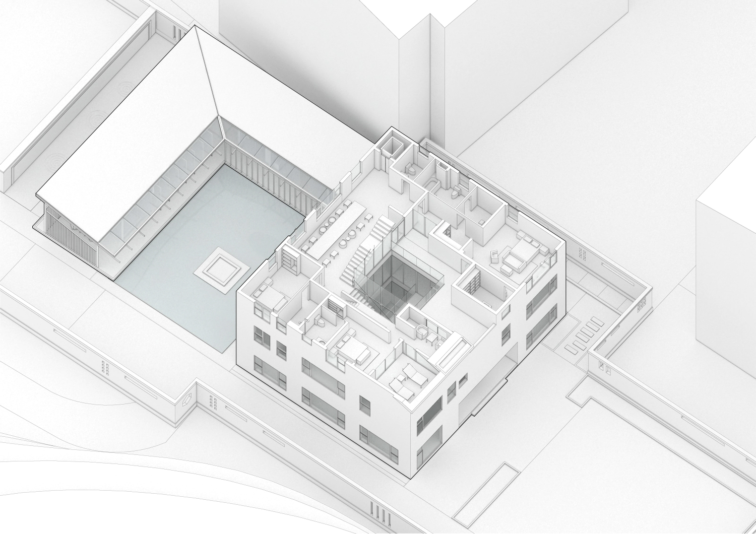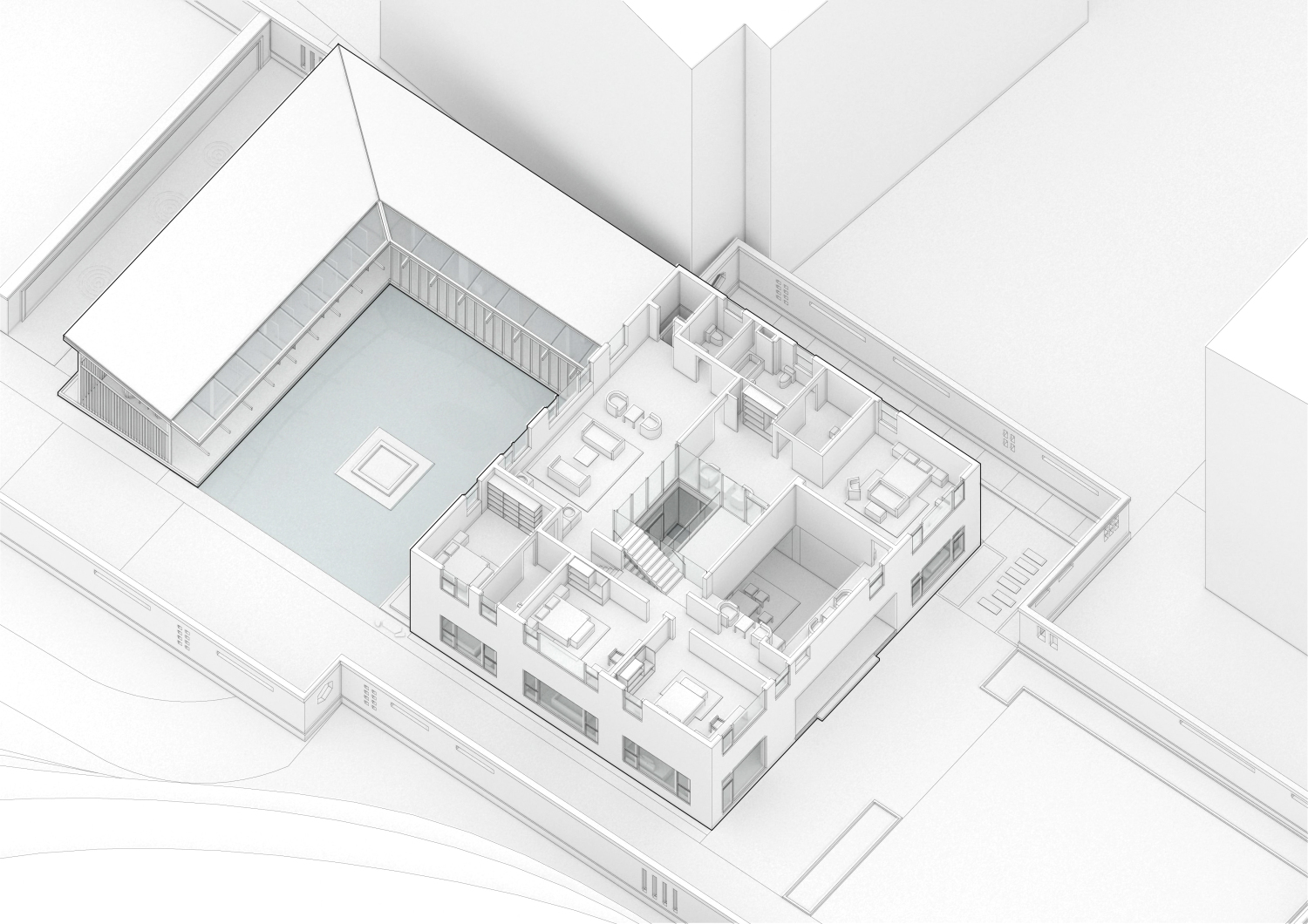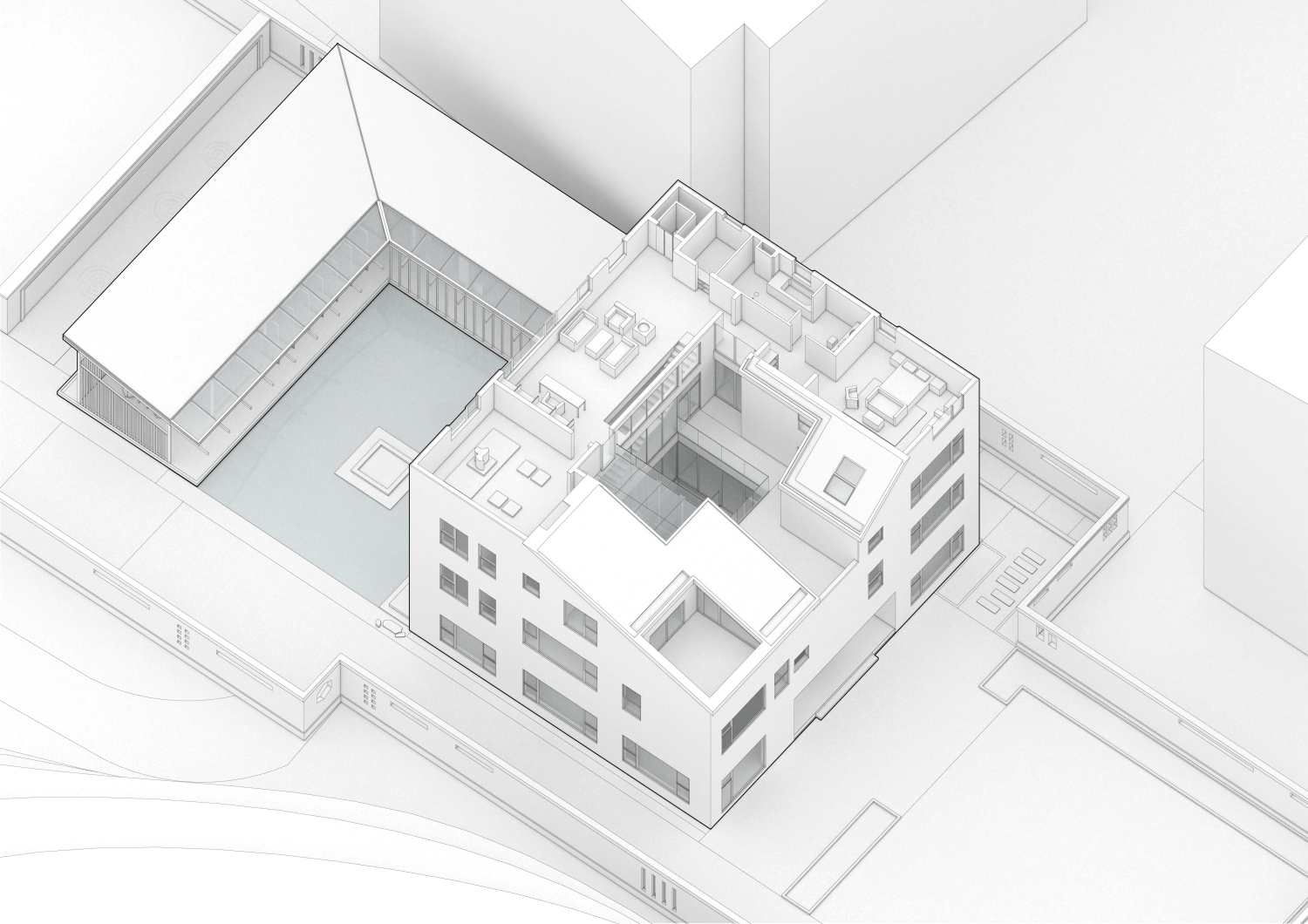 In order to allow more southward sunlight to enter the interior, the southeast corner of the building block is cut off at an inclined angle.