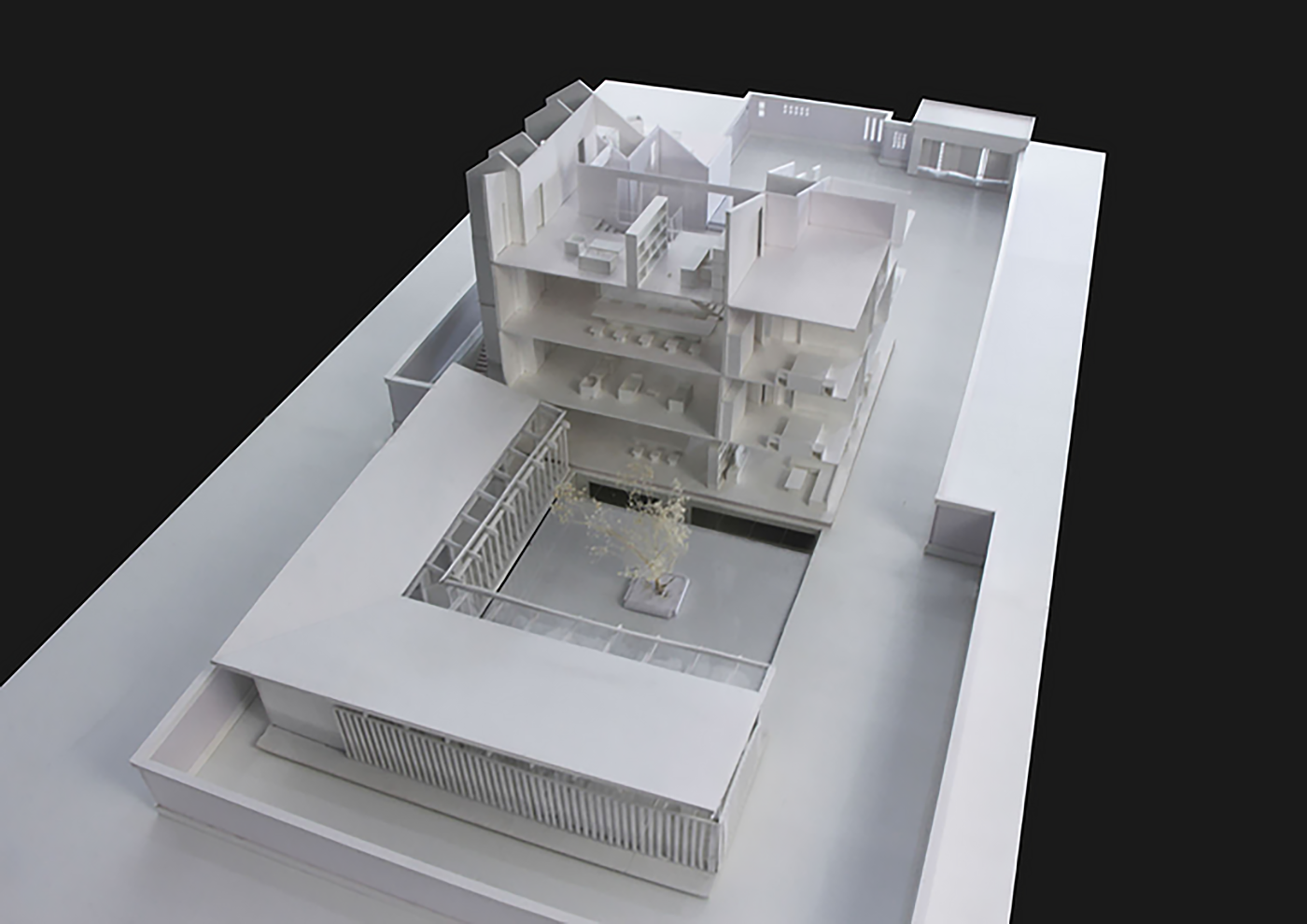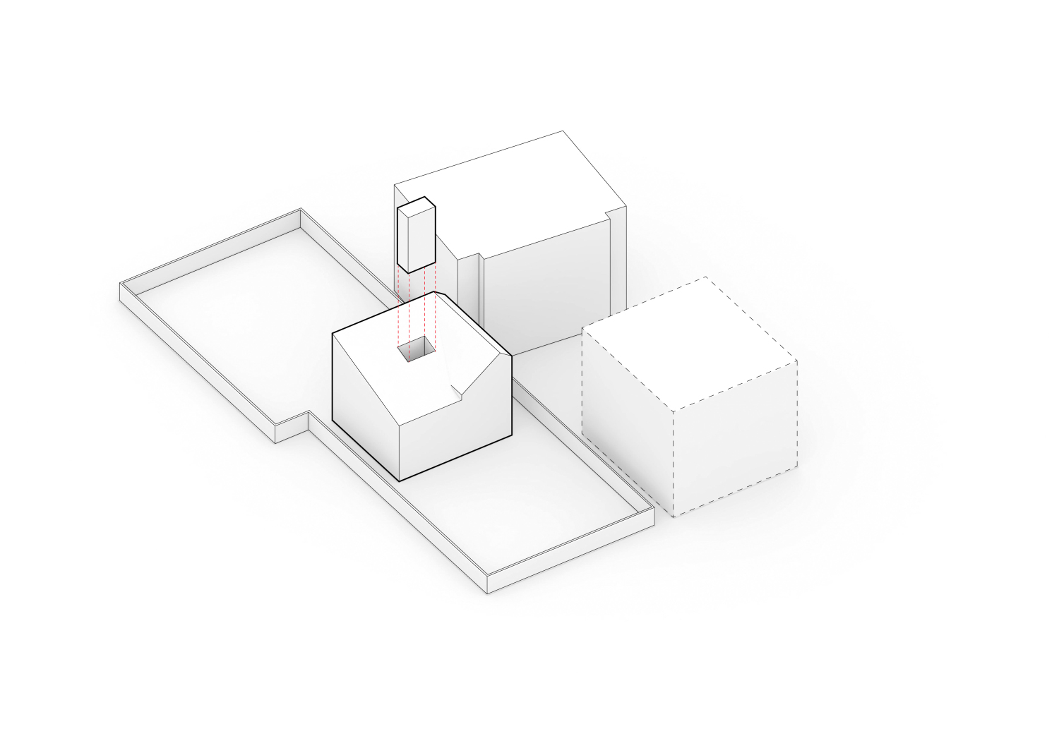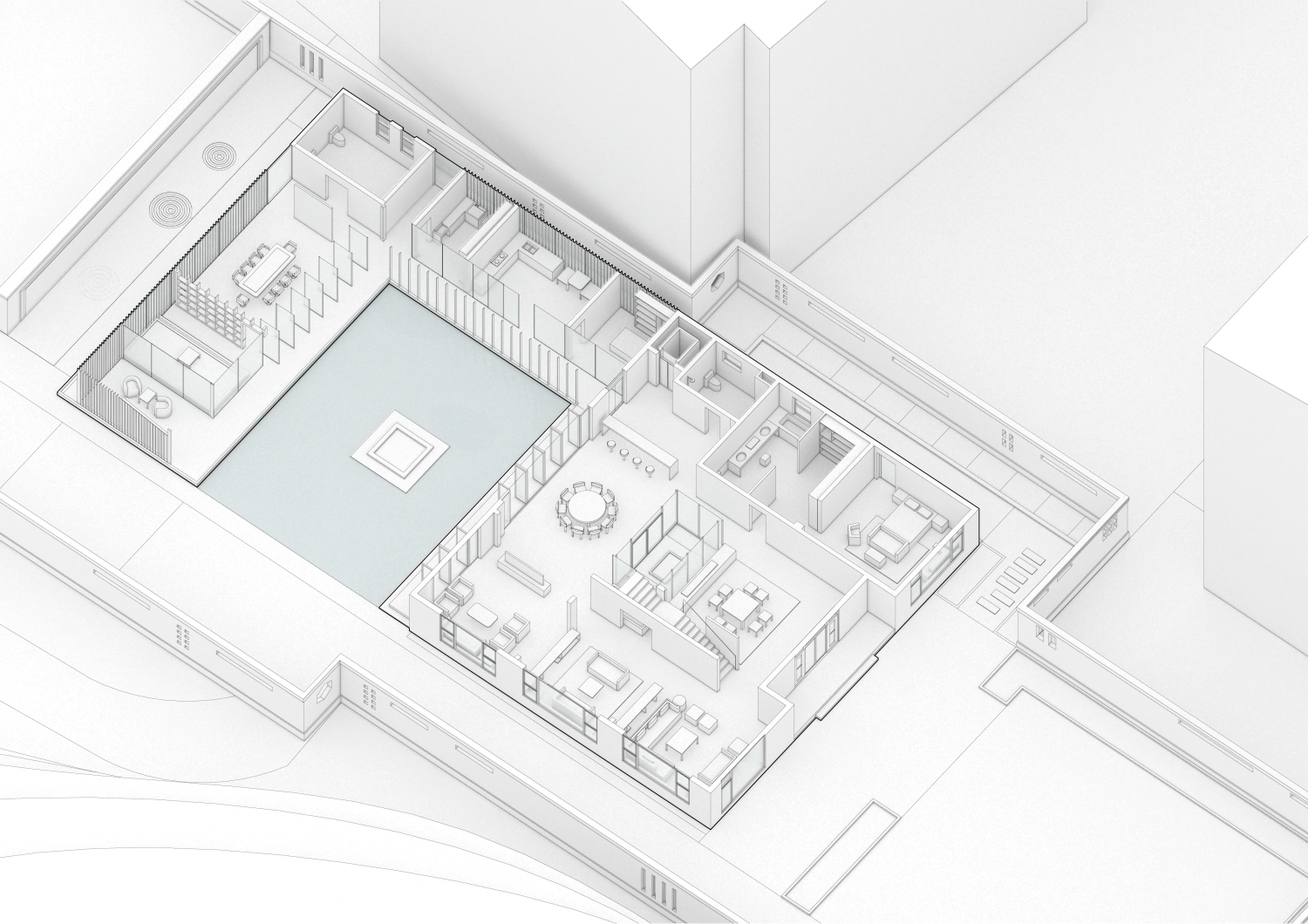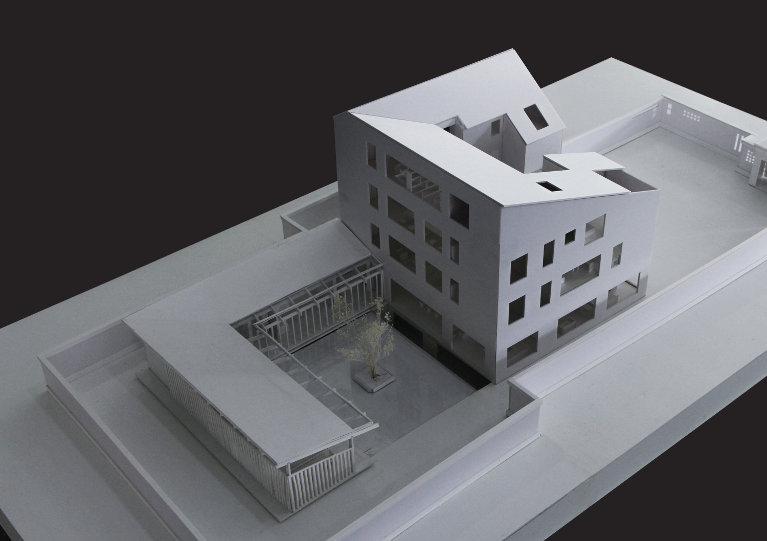 In order to allow more southward sunlight to enter the interior, the southeast corner of the building block is cut off at an inclined angle.