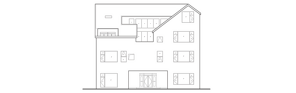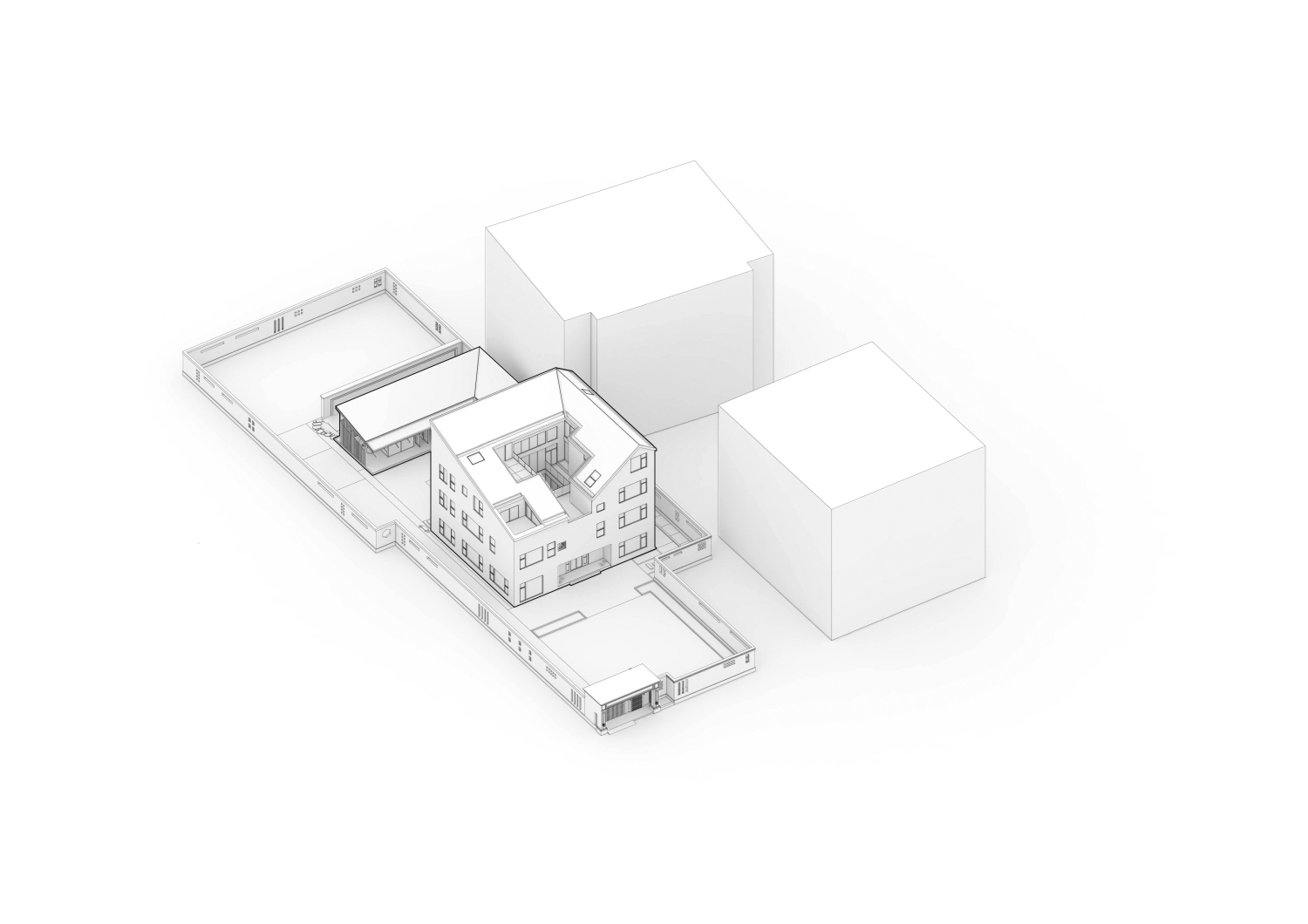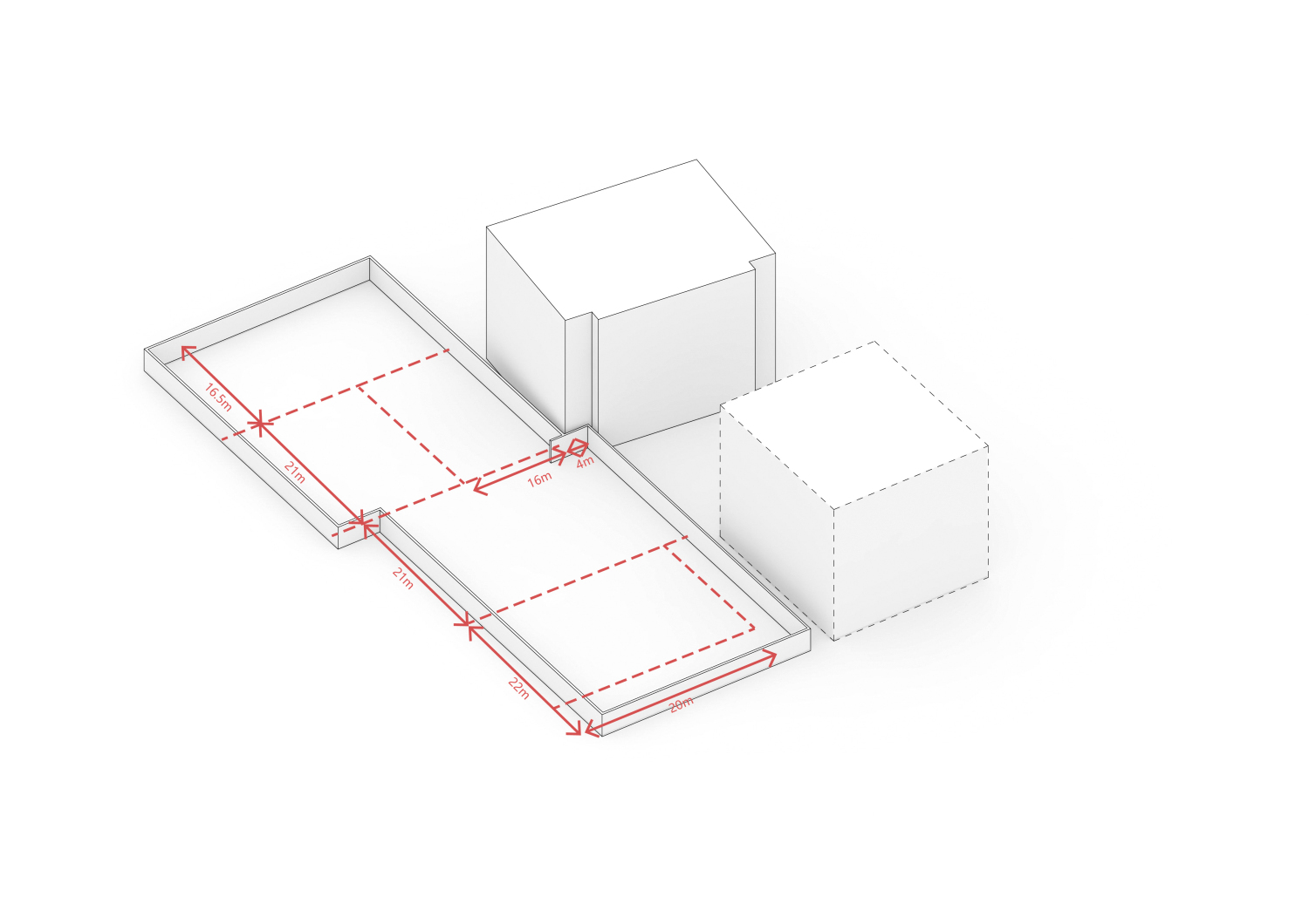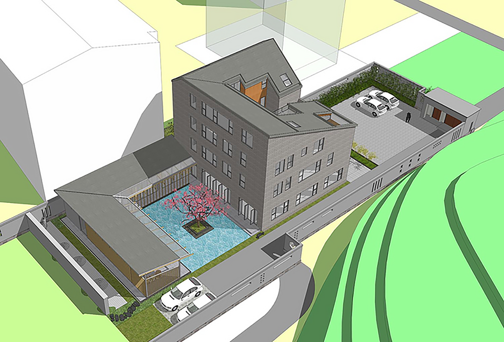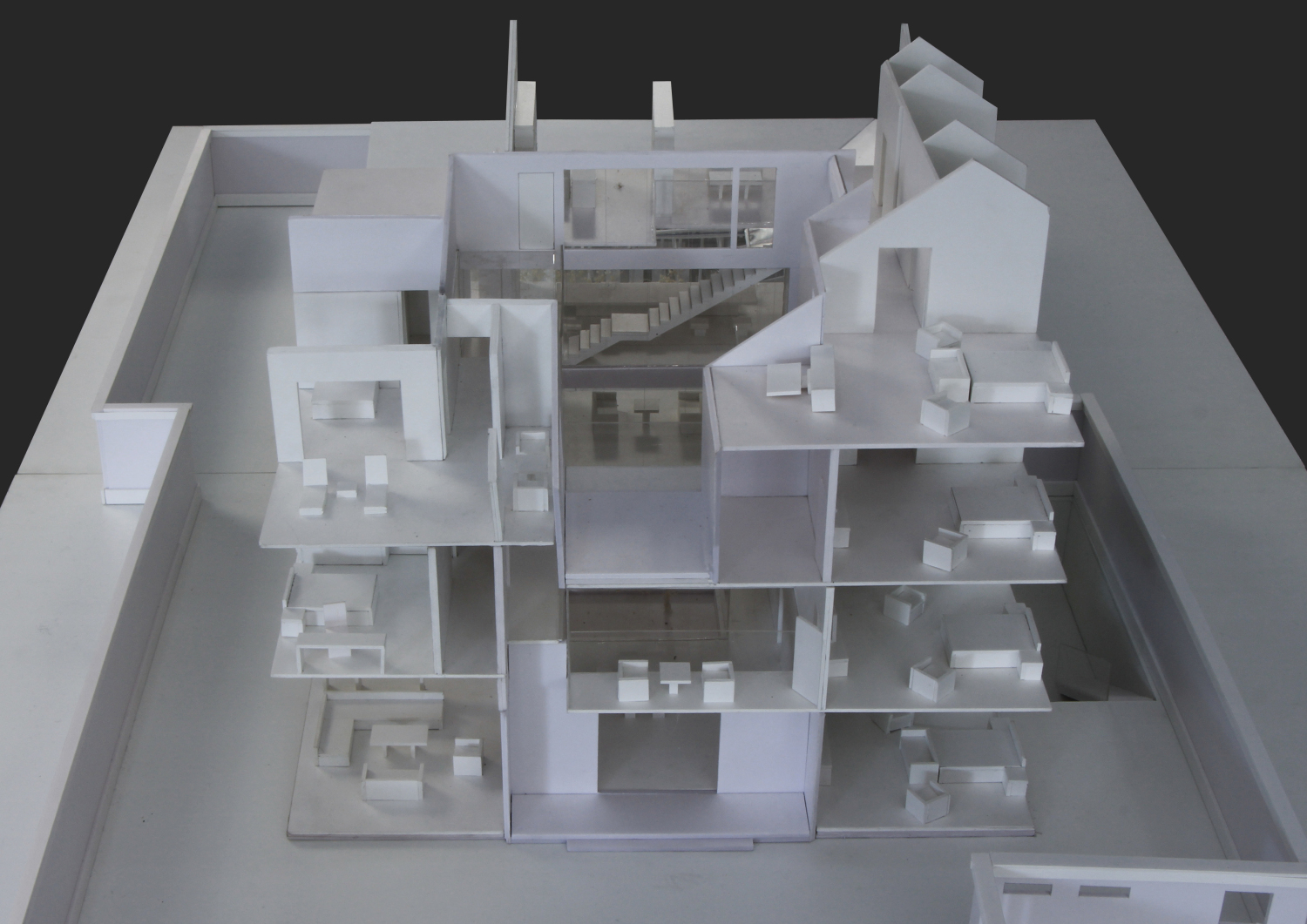 In order to allow more southward sunlight to enter the interior, the southeast corner of the building block is cut off at an inclined angle.