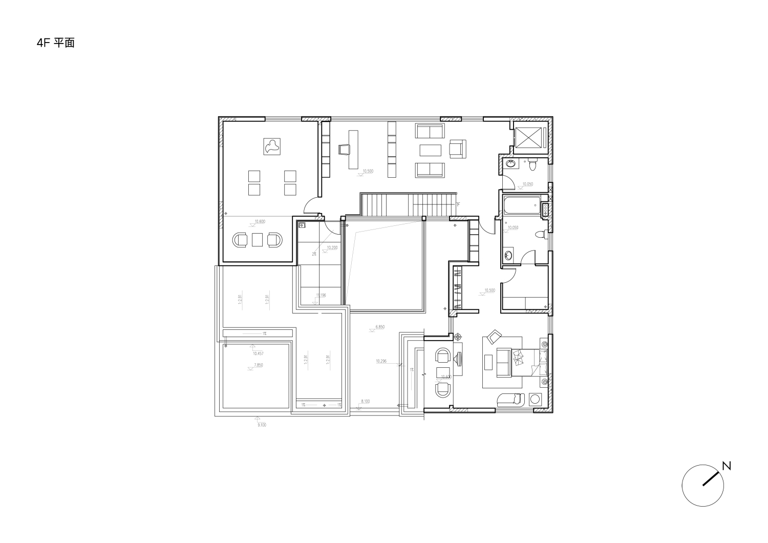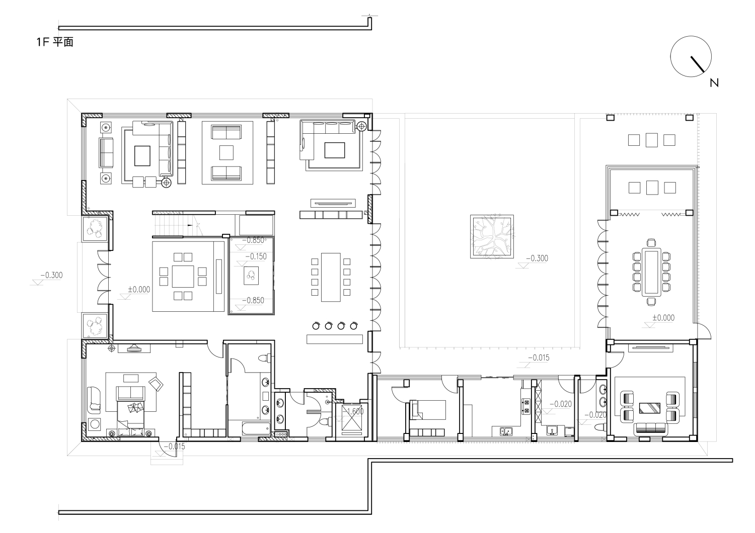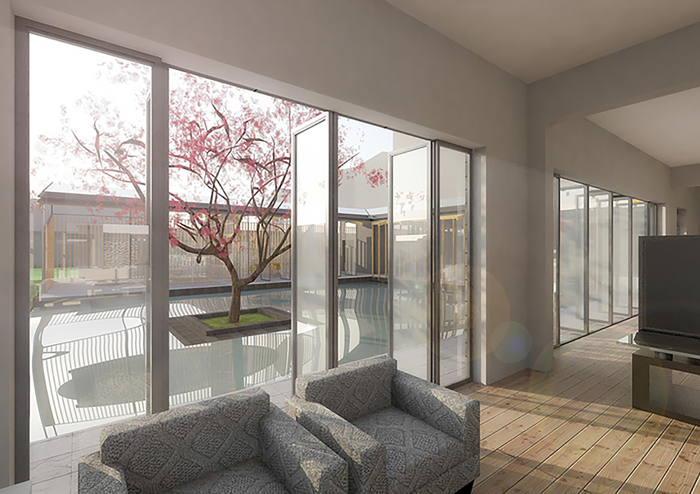 The living room and dining room are located on the east side of the pool, and the floor to ceiling glass windows that can be opened and closed allow people to have a panoramic view of the pool from inside.