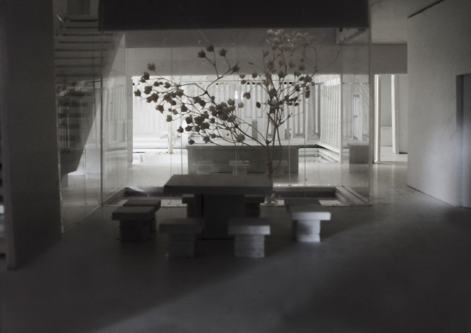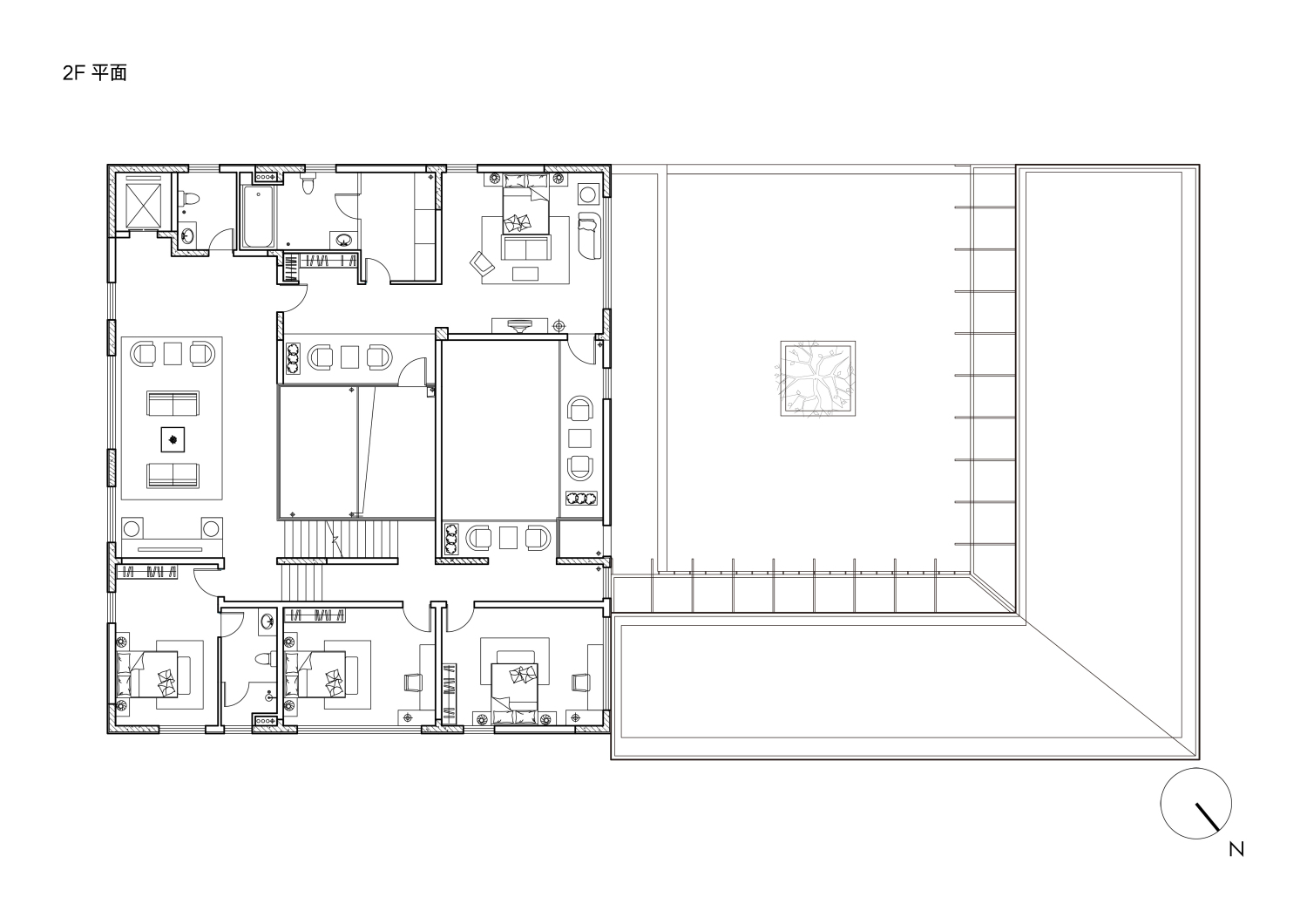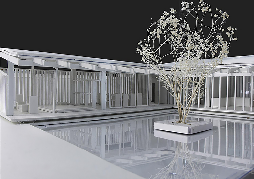 L形的副楼绕着水池,池水环着水中央的樱花树。闲步在水边,徜徉在这灵动之美里。