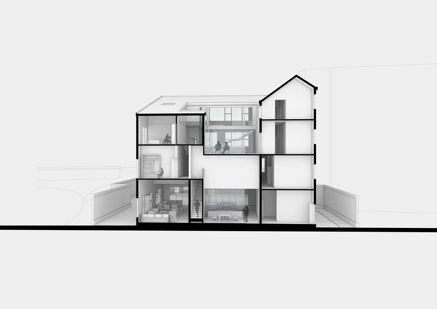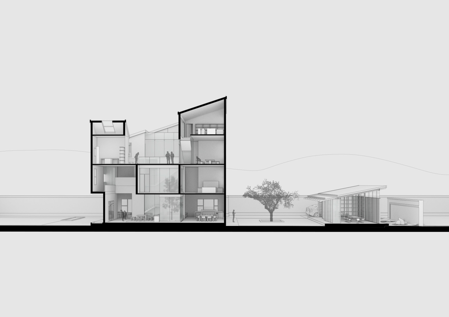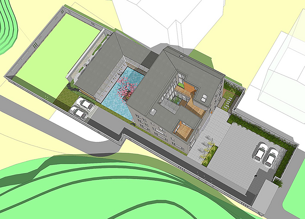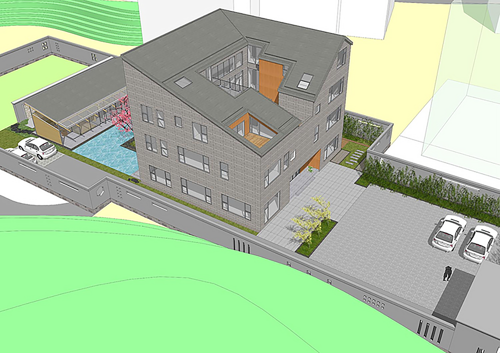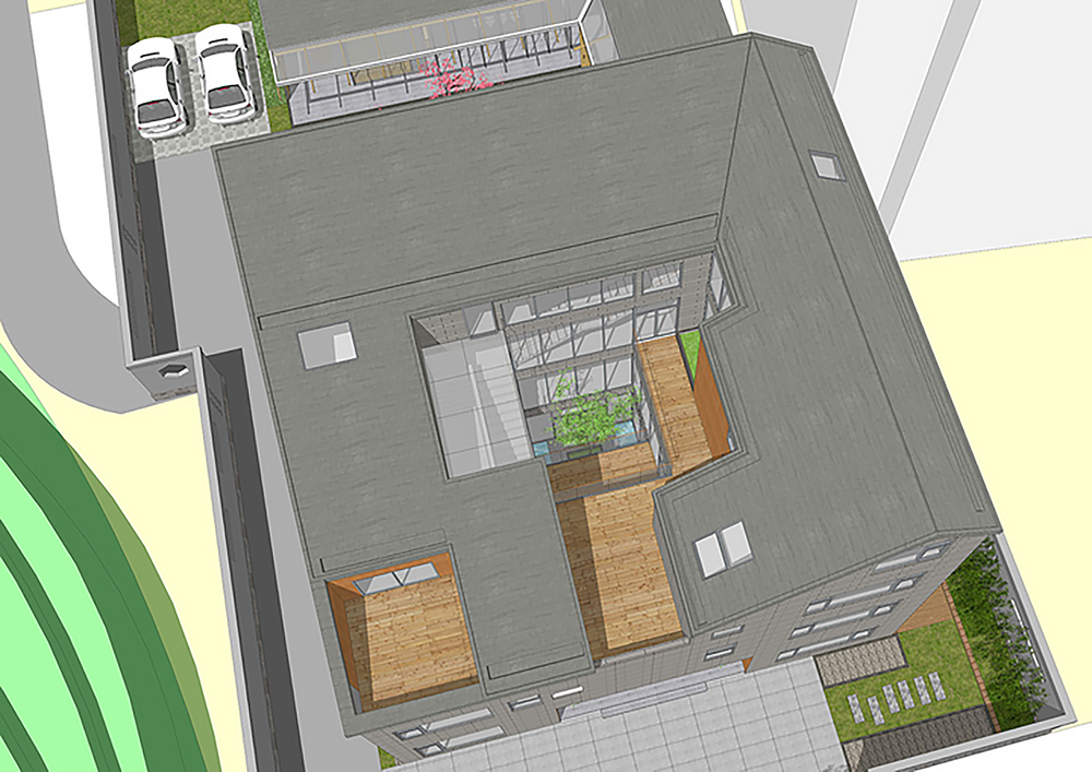 Introduction: This self-owned hosued loacated in Xiamen, Fujian. Two existing houses were close to the east and north corner of the site. We shaped the roof according to the sight from the closing blocks to keep the privacy of the user. The funnel shaped atrium contributed to the lighting and ventilation in the situation that the size of the structure are strictly limited. The straggered floor lead to the hight ceilling of living rooms on the first floor.