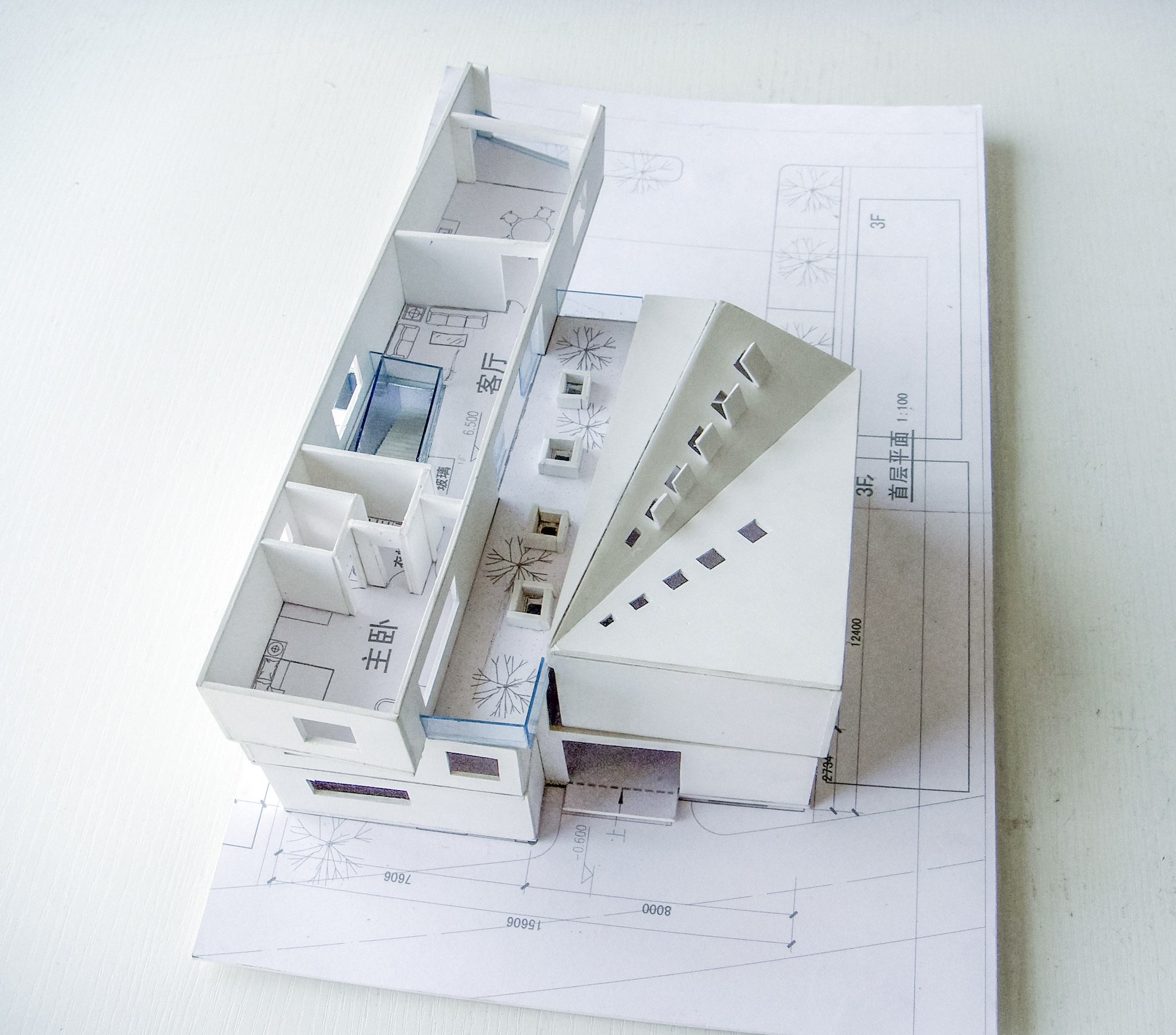 The working space adopted the sky light from the multiple sloping roofs. On top of it lay the living rooms, they all take the south light. The living rooms angled a little bit so it increased the space and privacy between the bedroom and neighbored building.