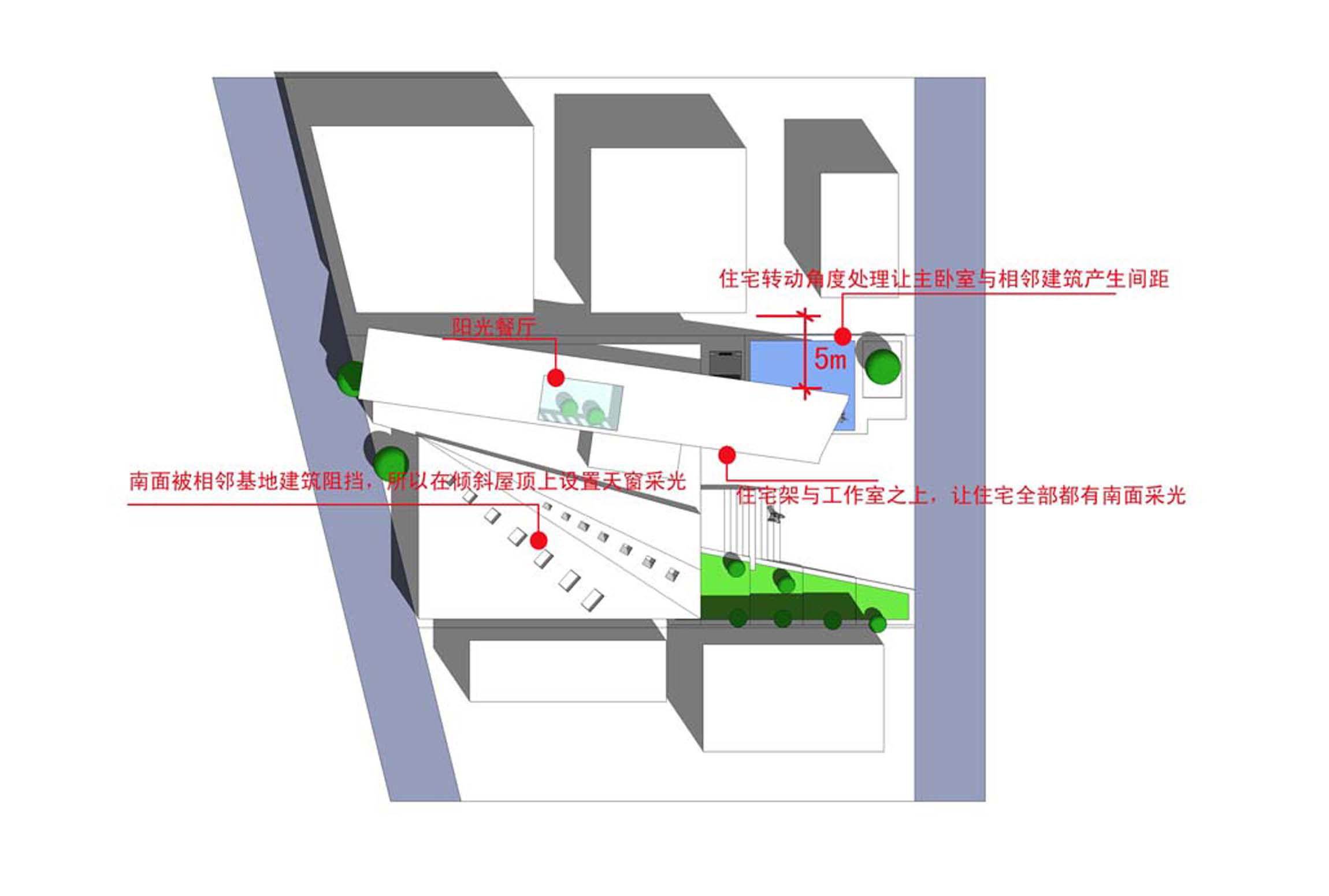 工作室采用多个坡度的屋顶天窗采光。住宅架在工作室之上,使住宅全部南面采光。同时住宅转动一定的角度,使主卧室与相邻基地的建筑产生一定的距离,增强私密性。同时主卧室架在庭院之上,居住环境雅致。