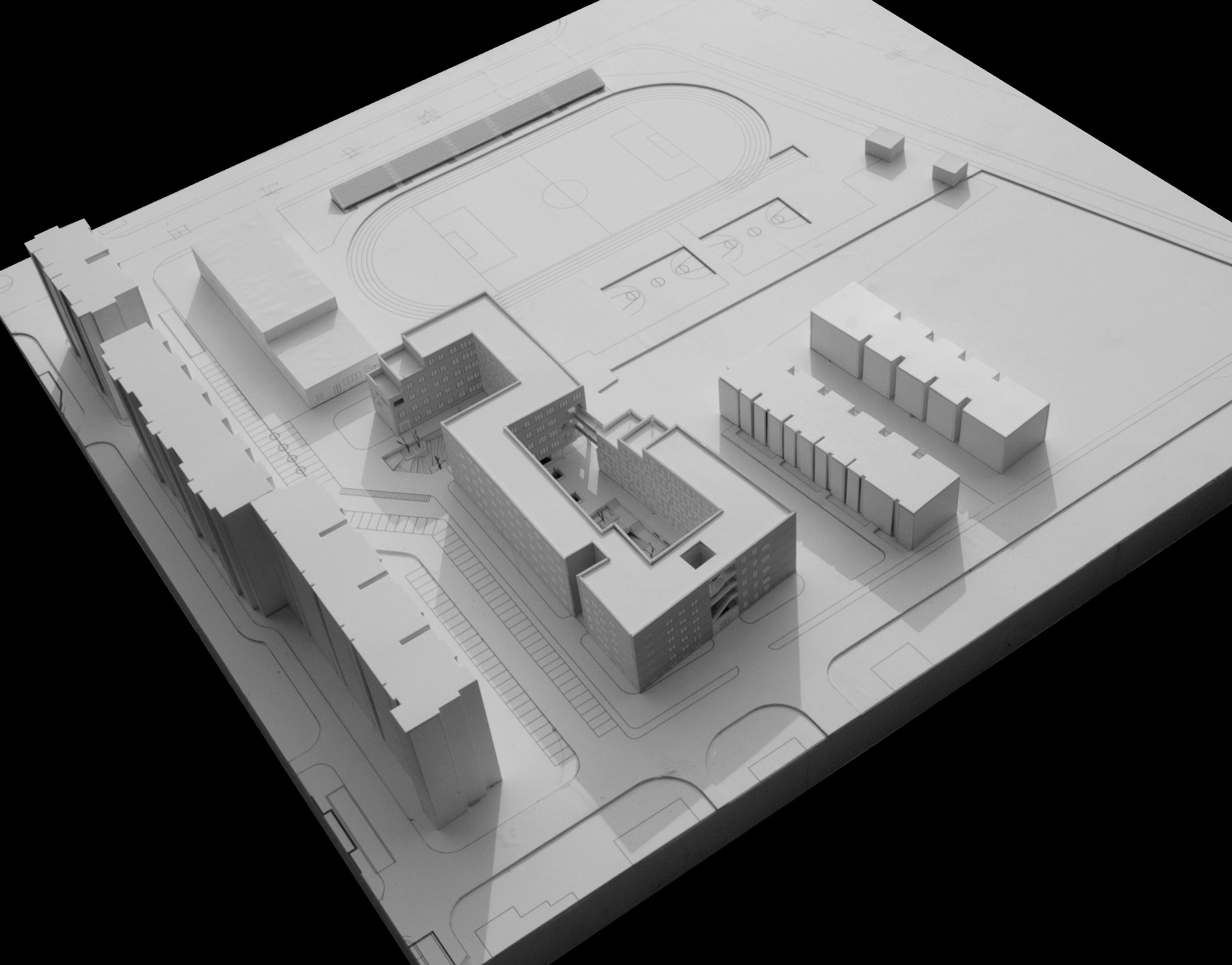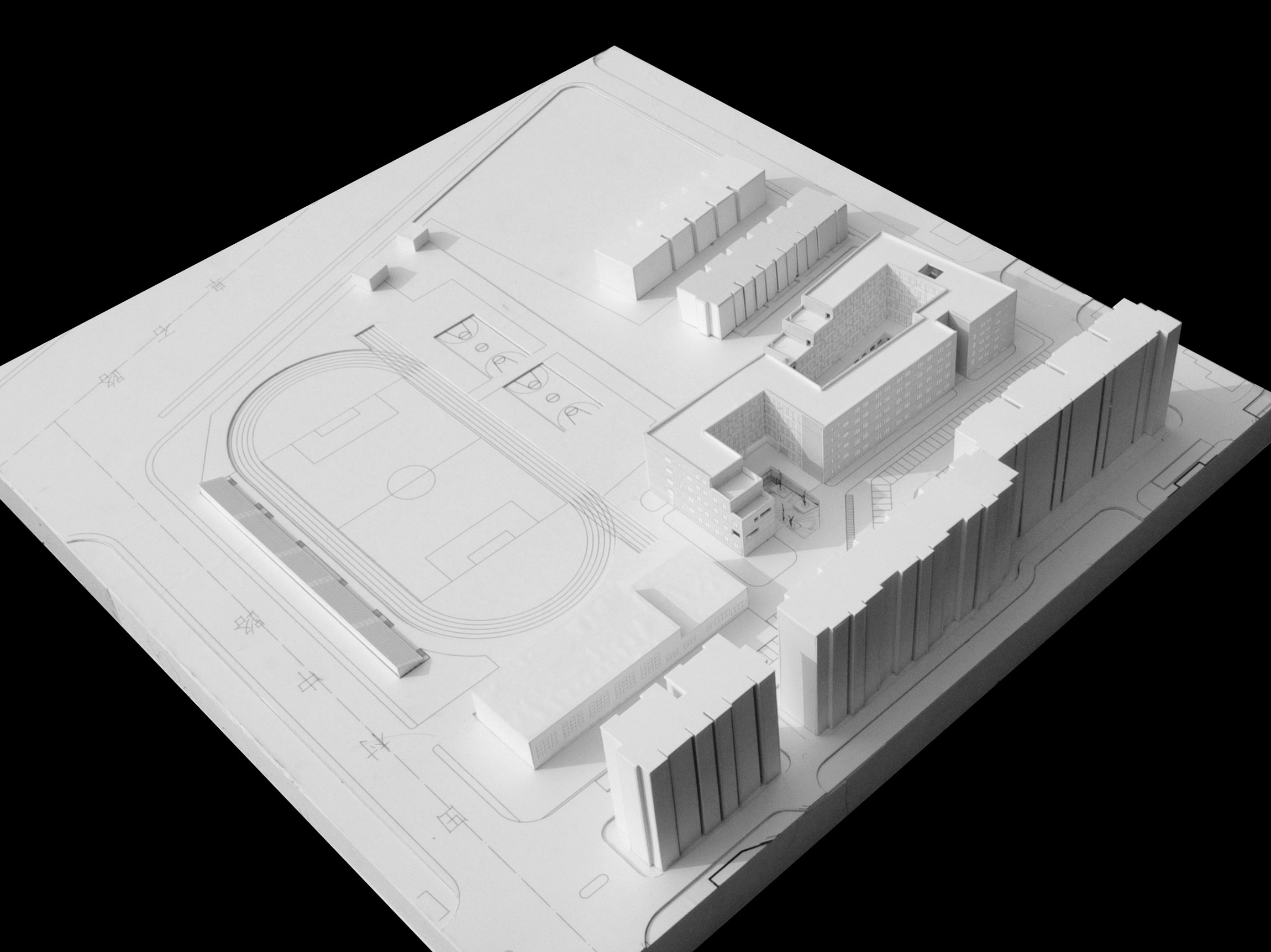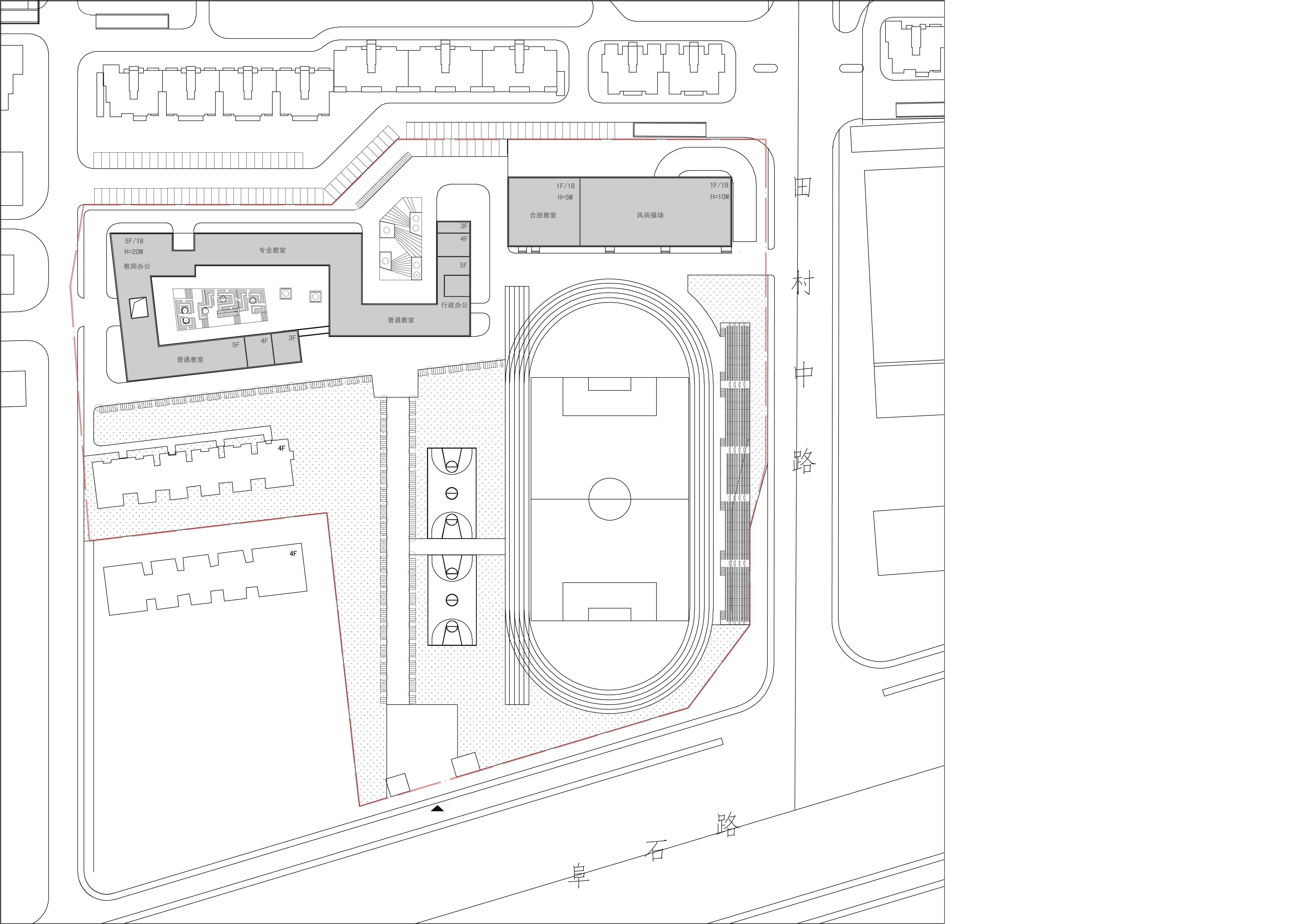 Introduction: a normal high school is usually consisted of study hall, experiment building, office building, executive building, cafeteria, lecture theatre, sports court. In this project , the site is small and limited, residential to the north and south, highway flied by. The paradox lay here, we had a space of kindergarten and we had to stuff all these building inside.