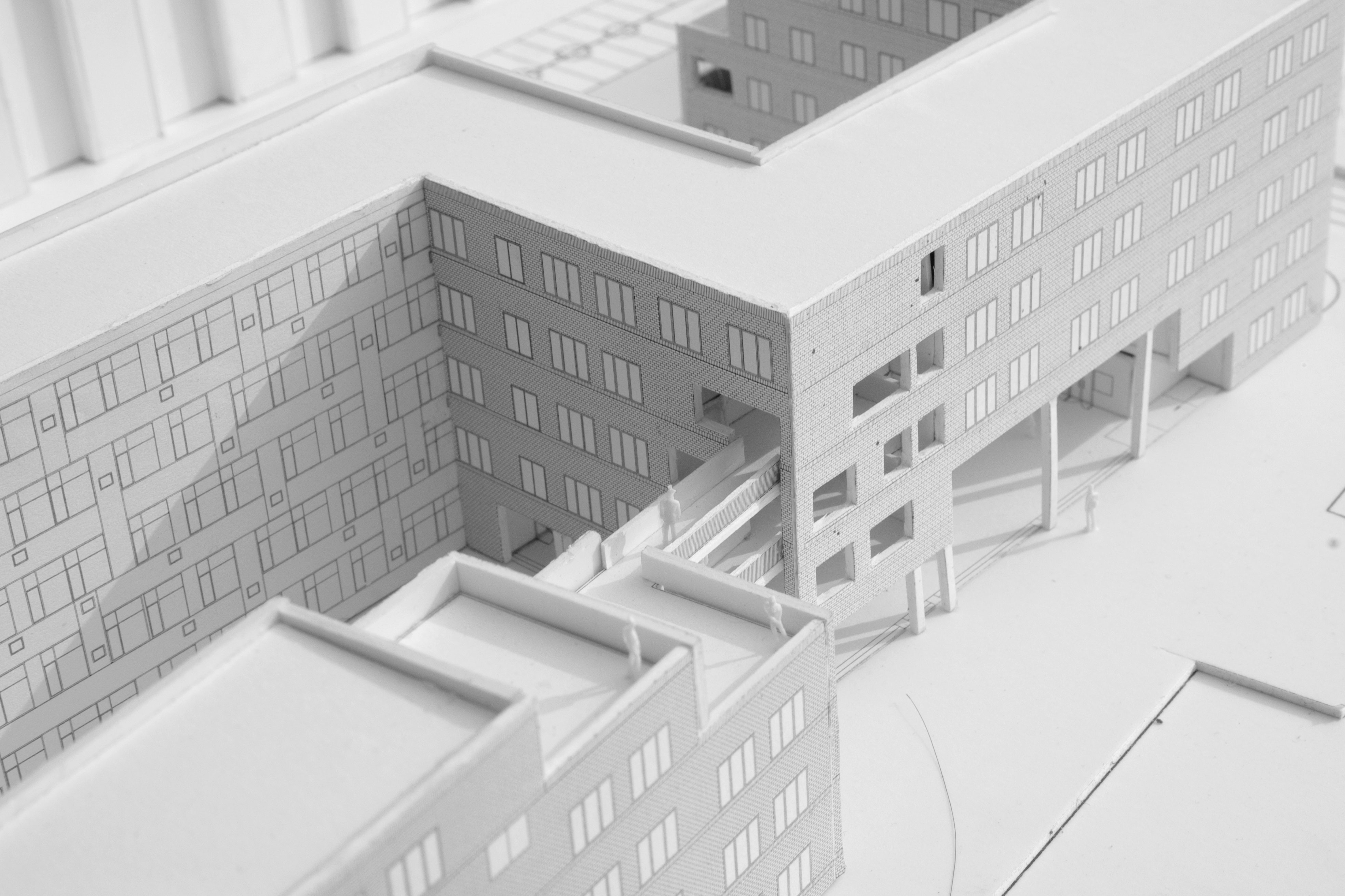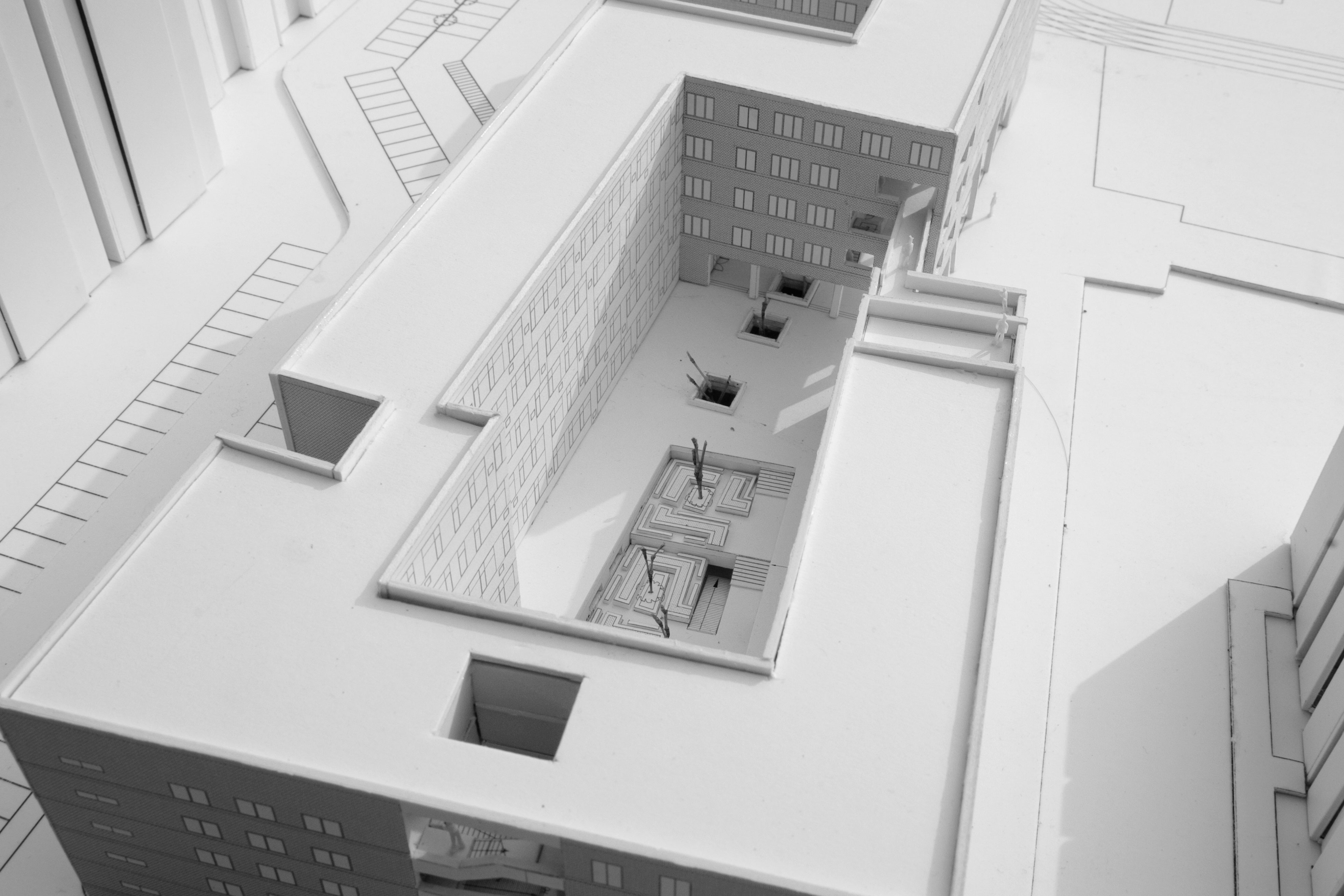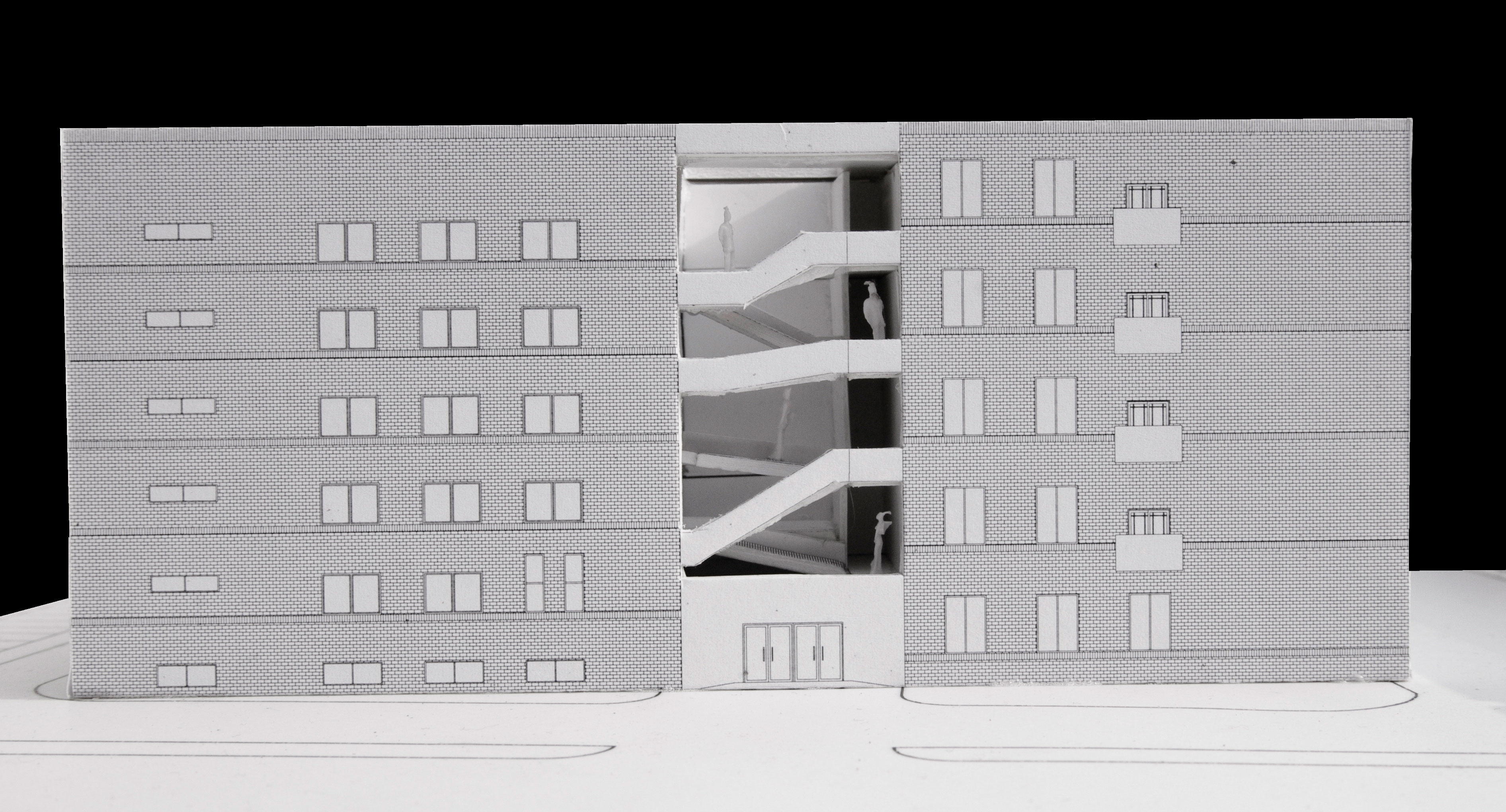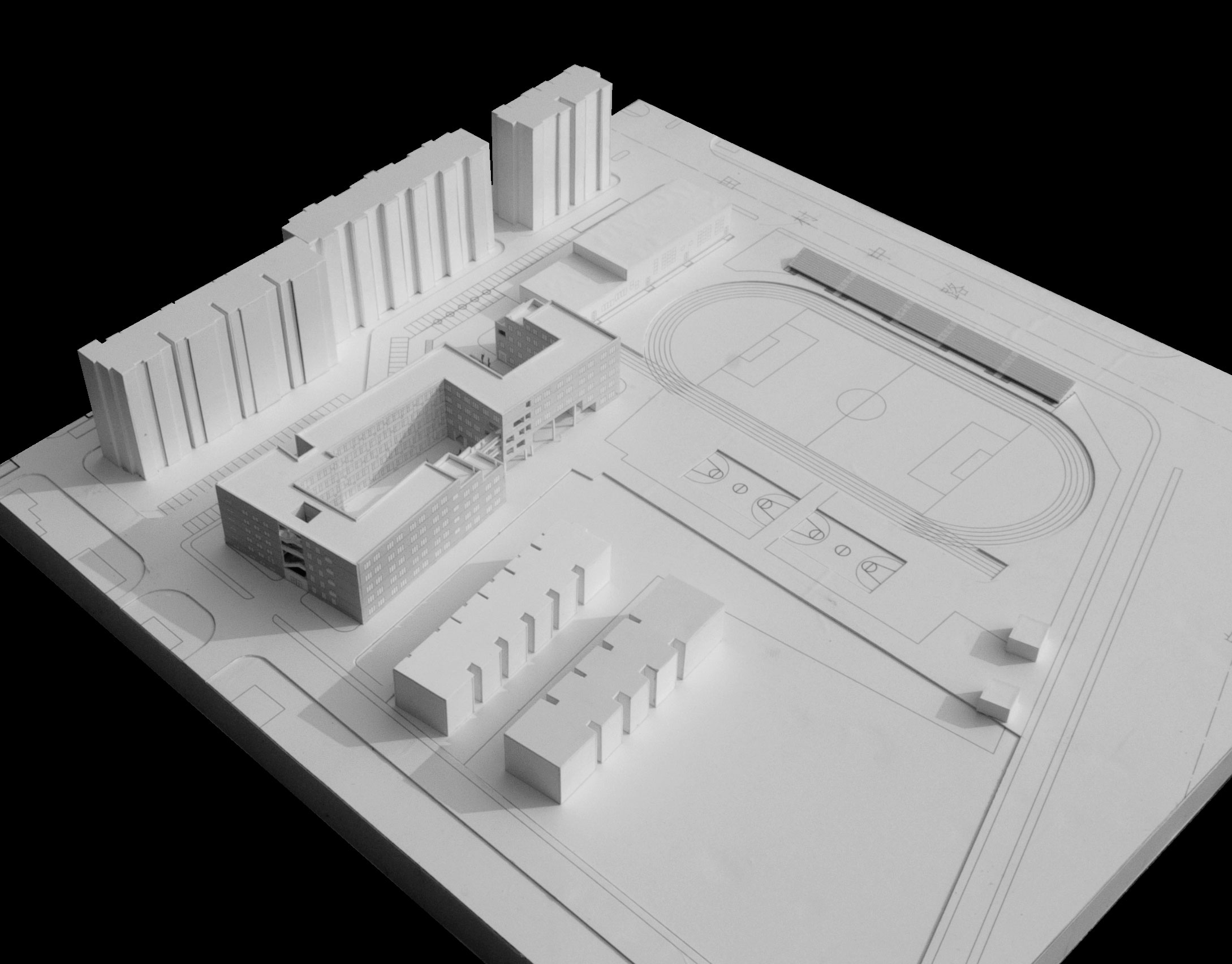 Introduction: a normal high school is usually consisted of study hall, experiment building, office building, executive building, cafeteria, lecture theatre, sports court. In this project , the site is small and limited, residential to the north and south, highway flied by. The paradox lay here, we had a space of kindergarten and we had to stuff all these building inside.