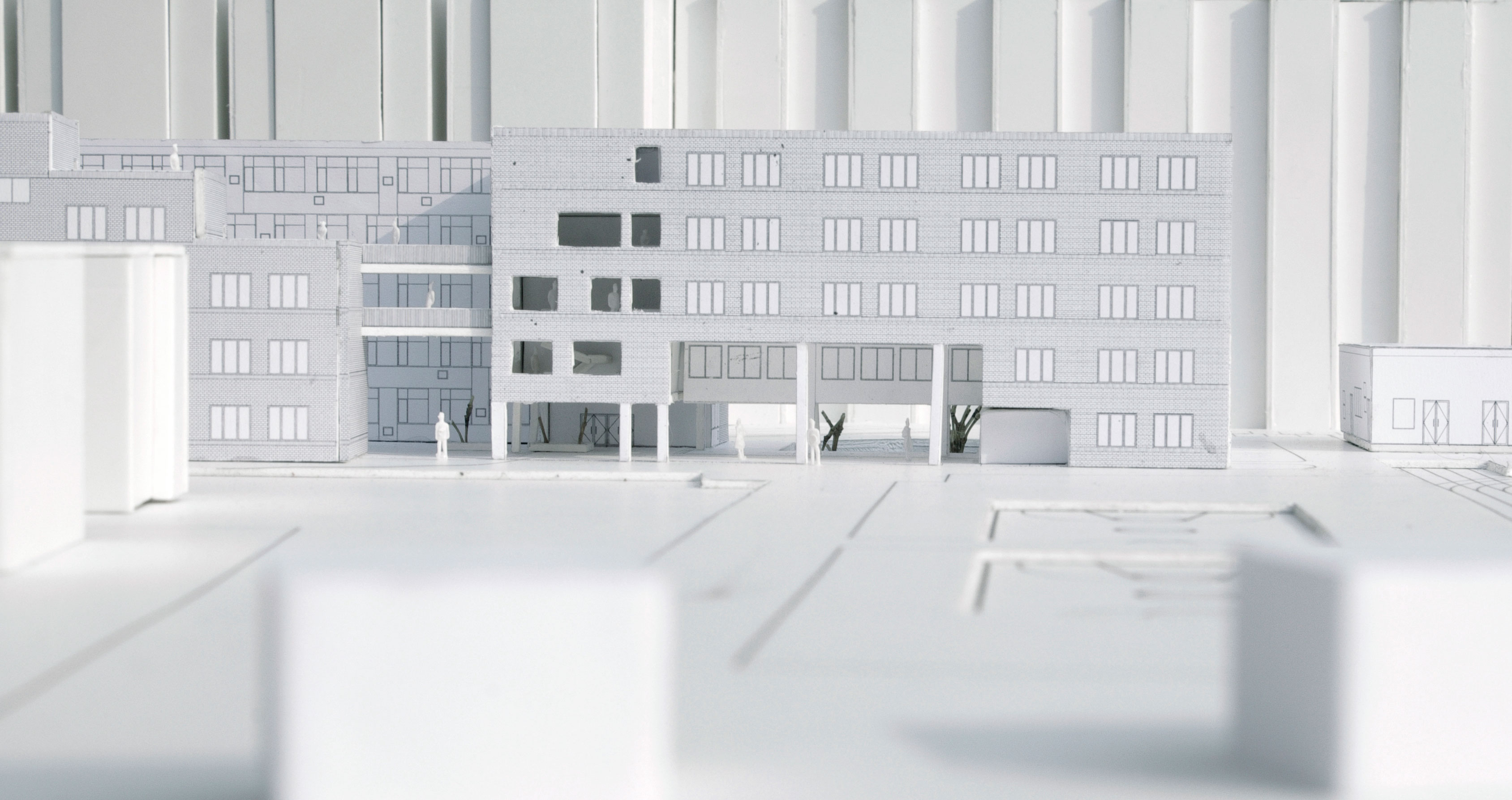 简介:一般中学会由教学楼、实验楼、教师办公、行政办公、食堂、阶梯教室、风雨操场、露天运动场地等多个建筑组成。本项目由于场地的限制,北有住宅区,南面有现状住宅遮挡,临近高架桥干扰,基地面积非常小而且前后左右都受到限制,不可能像一个普通中学那样由很多不同功能的楼组成,但是这些基本功能的空间中学又是必不可少的,曾在极大的矛盾。