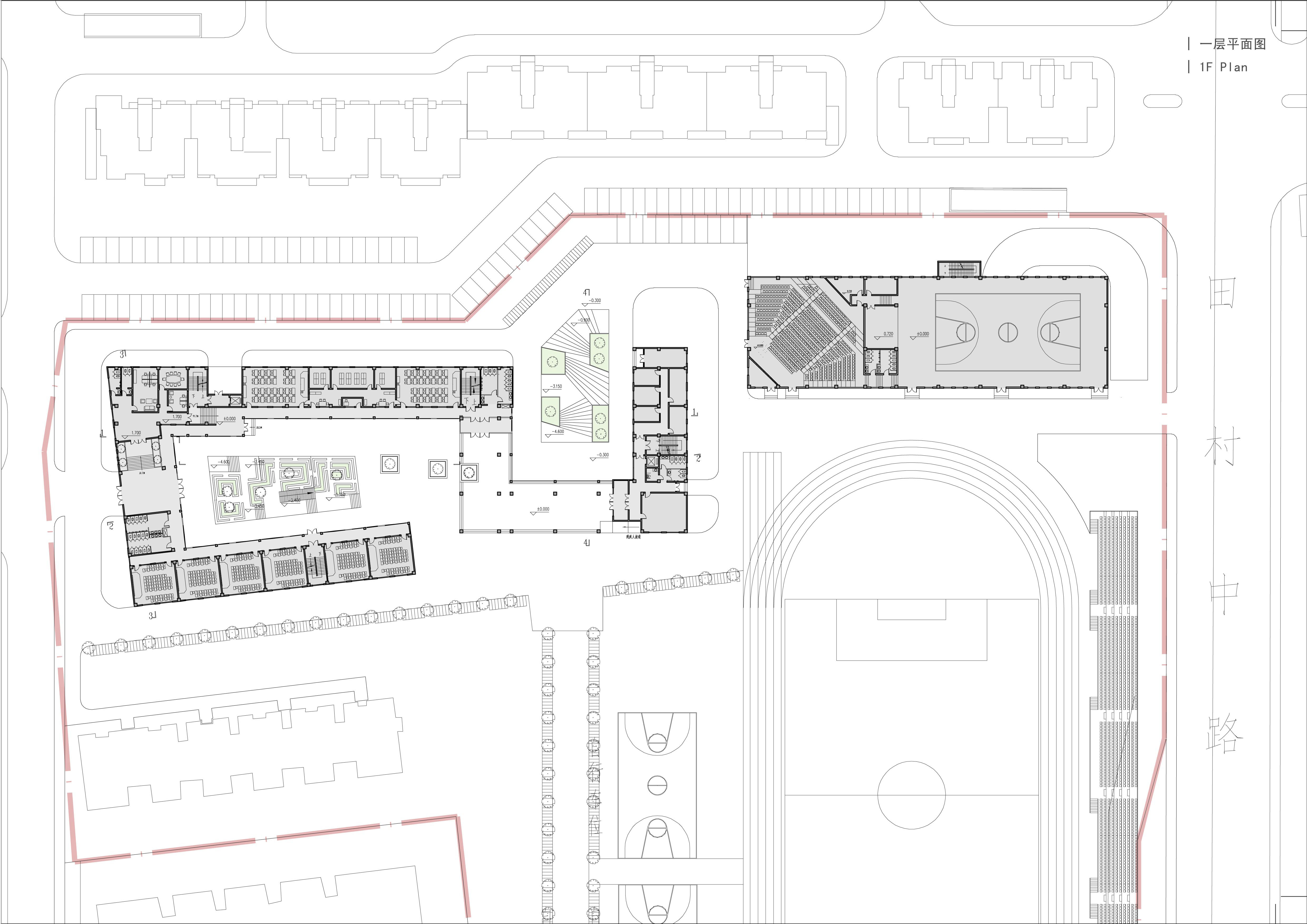 在做一个幼儿园的场地内做下普通中学基本是不可能的事情。 我们把教室、实验室、教师办公、行政办公、地下食堂、阶梯教室、风雨操场、地下停车等综合在一栋楼上。地下通过食堂和地下车库连接、地上地下空间通过两个互通的下沉庭院连接、楼上各个空间有机组合在一个环形的体块内,非常经凑。但这样做必然会带来一些问题,例如地下食堂采光通风、各个空间需要的层高不一样、课外活动场所有限、师生流线干扰、学生之间相互难交流。