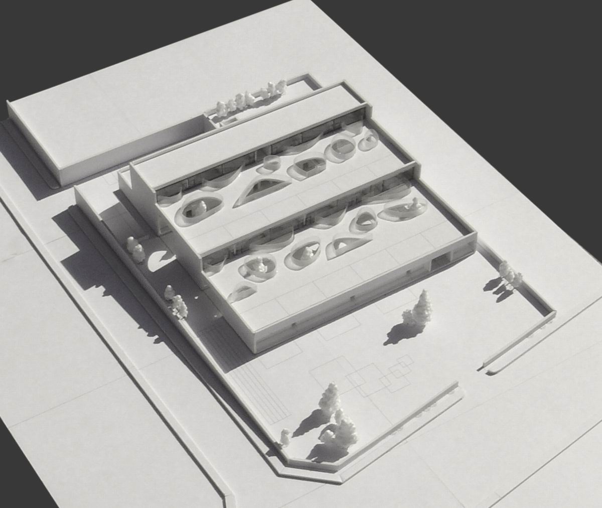 The roads relate the roofs thtend to be curvilinear corrdors and courtyards.it make spale on the roofs and in to courtyards more interesting.what’s more?The space under the coniders and greenbelt have a very closed belate with the living units on the frist fllor.