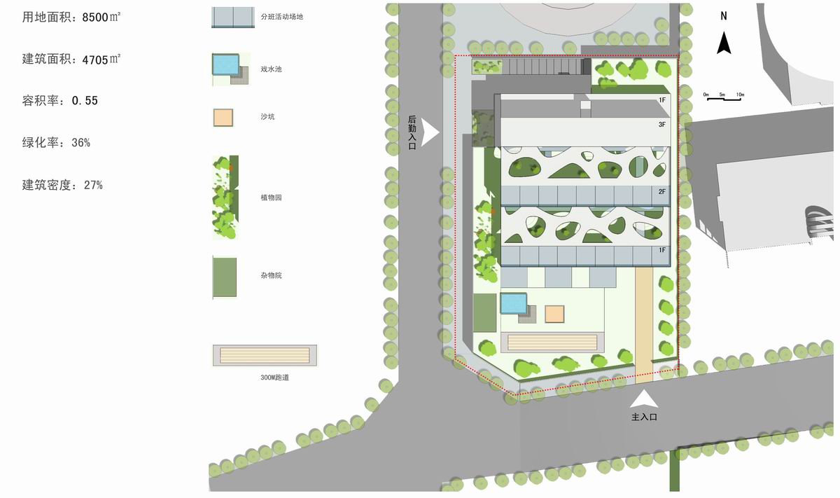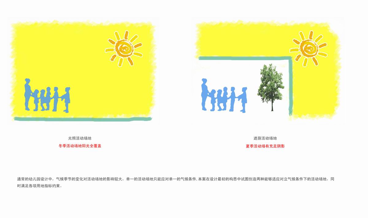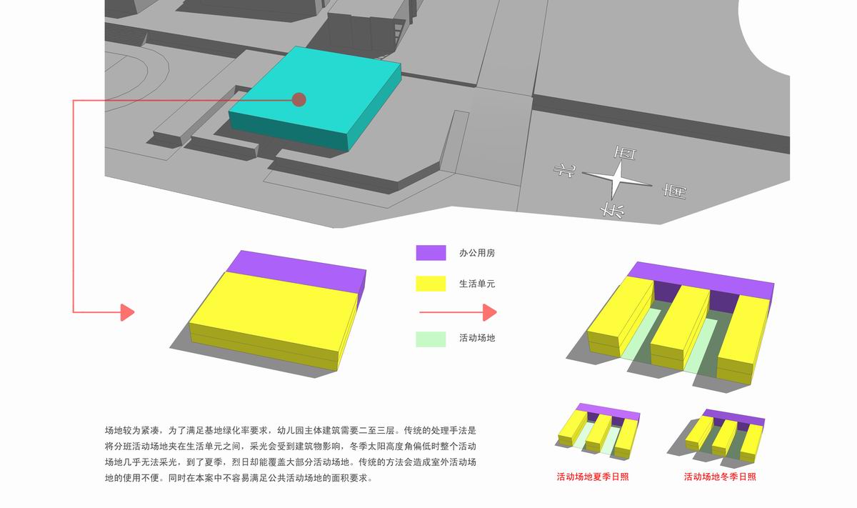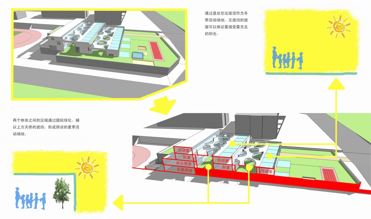 简介:此幼儿园采用南北三排布置生活单元,由南向北依次退台升高。北面生活单元可以利用南面的屋顶作为活动场地。屋顶活动场地日照条件较好,适合夏天活动。