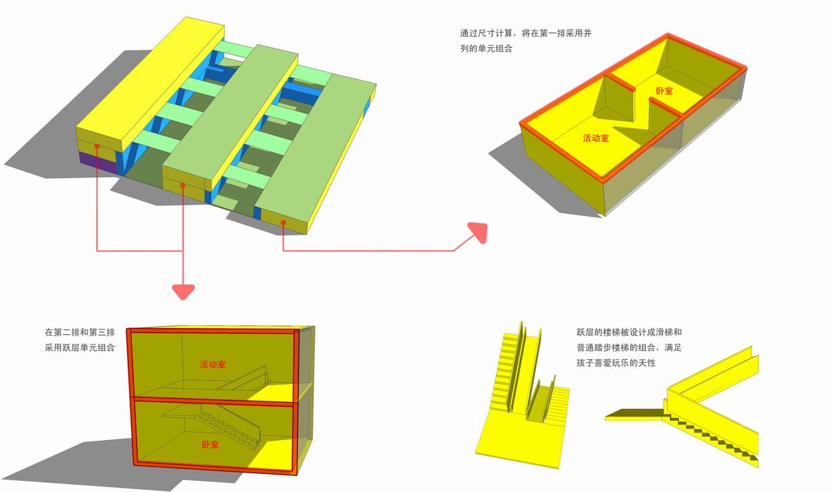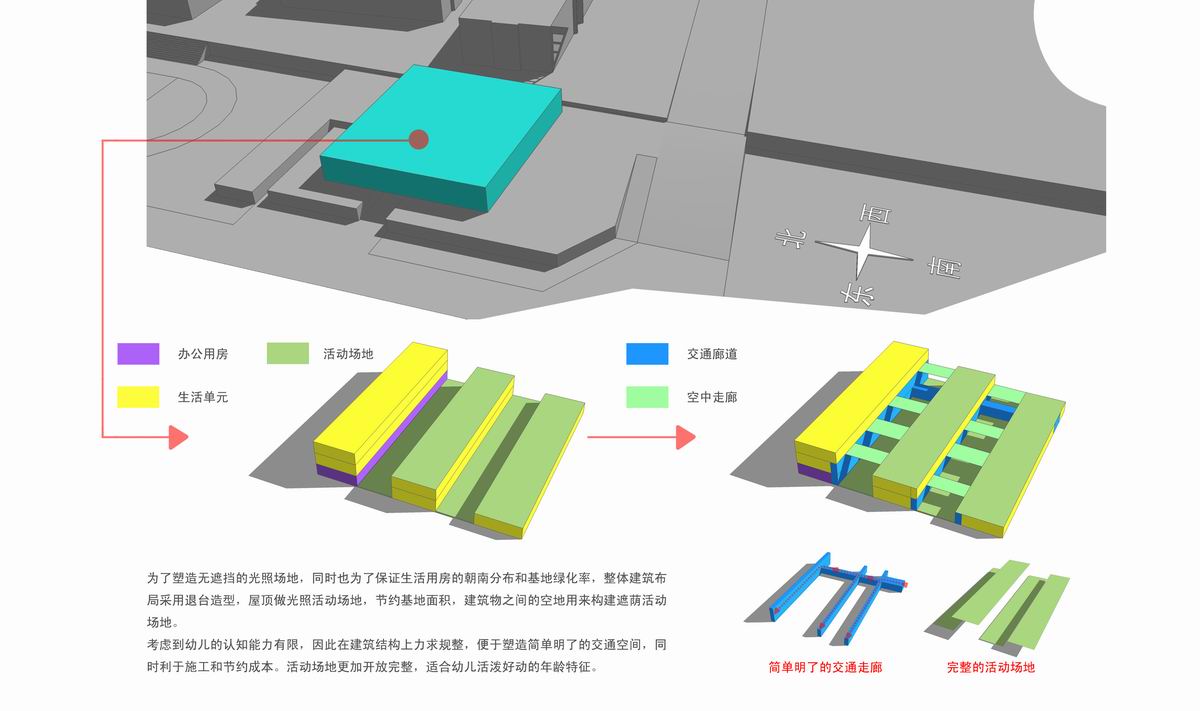 Introduction: we make the living units in to kindergarten into three rows from the north to the south .the rise the platform higher and higher form the north to the south .the living units to the north can we the roofs form the south to be activity spale. The activity spale on the roof have a sunshine condition. It is very suitable to have activities in summer.