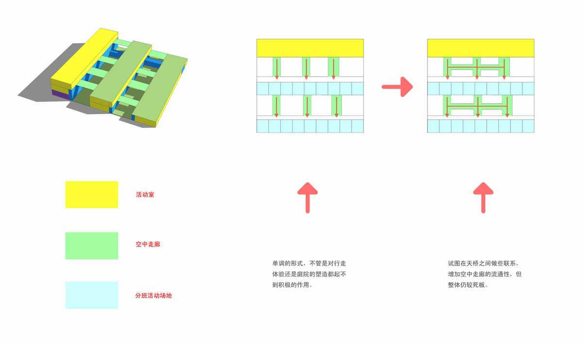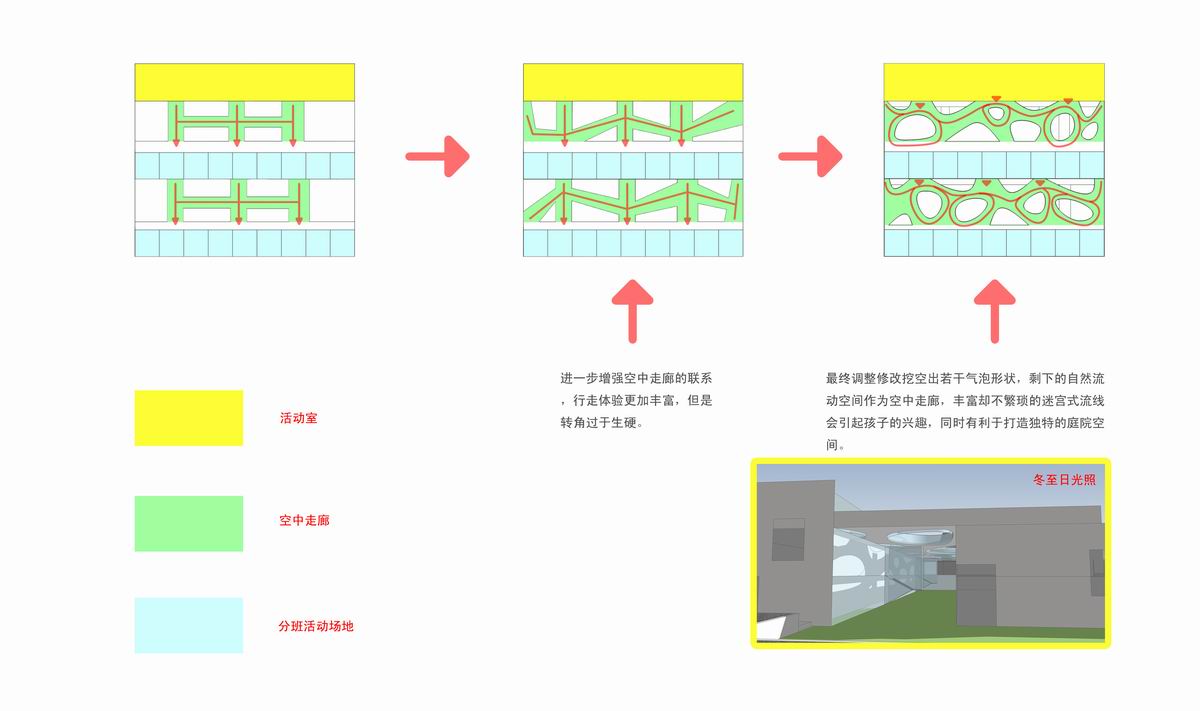 连接屋顶活动场地的走道根据流线功能延伸为曲线的连廊和庭院,这样屋顶空间和庭院空间更有趣味性,而且此连廊下面的空间与绿地和一层生活单元联系紧密。可以作为一层的分班活动场地。