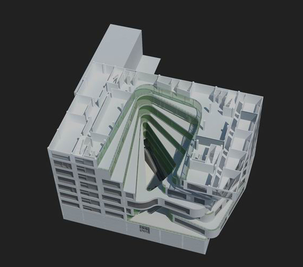Thirdly: courtyard: when sitting in the reading room, readers need a place for individual intercommunications, resting and phone calls, therefore we make a middle courtyard consisted with enclosed back units at the connection between the south building and the north building providing a walking space and resting space as well. The distance of south-north direction is very long. Based on this, if we design a normal square middle courtyard for daylighting,the reading room is actually a daylighting towards west although the building is along the south-north direction.The sunshine in the afternoon from the west is not suitable for the reading room. Therefore wo adopt the triangle middle courtyard to turn the east-west direction into south-north direction, reducing the area in the west side and increasing the daylight area in the south side, resulting in more daylight from the south side. The space in the west side where is not suitable for reading is designed to be a courtyard and corridor as the leisure and walking space.