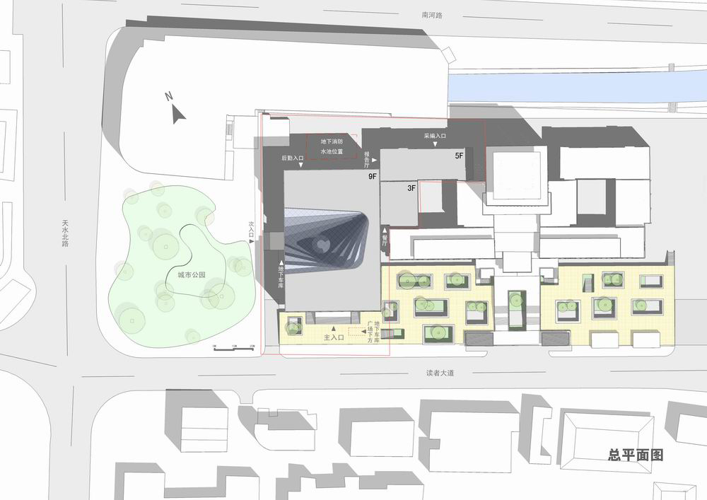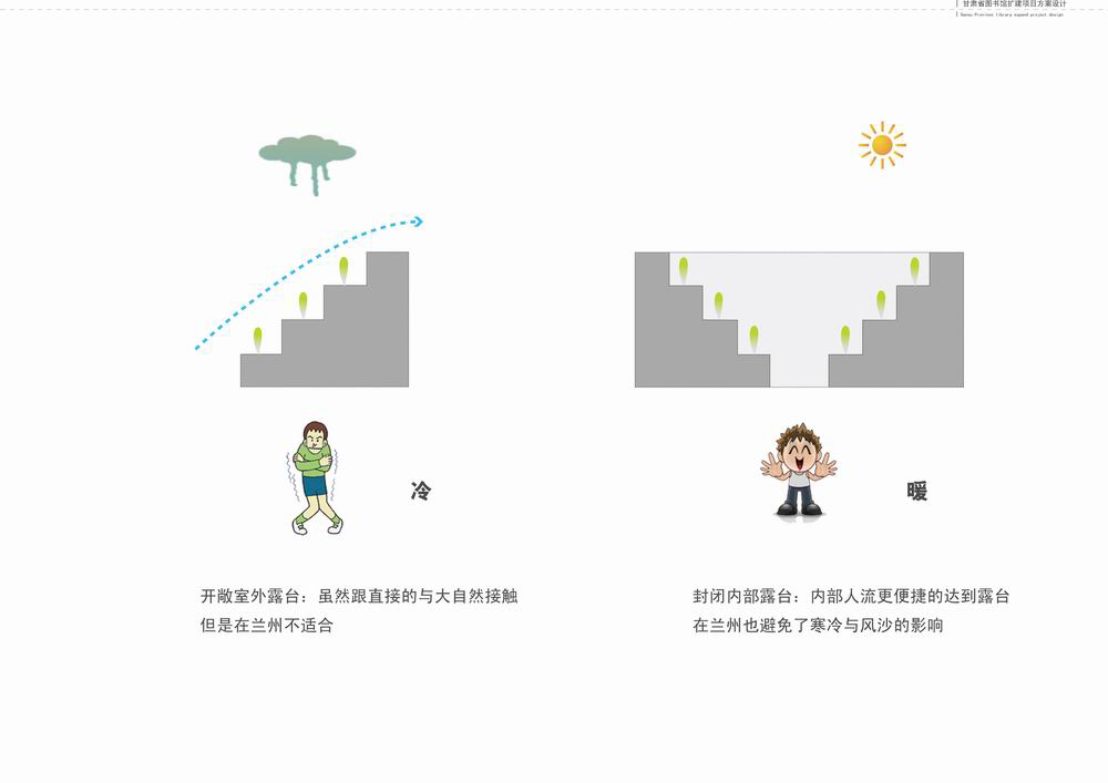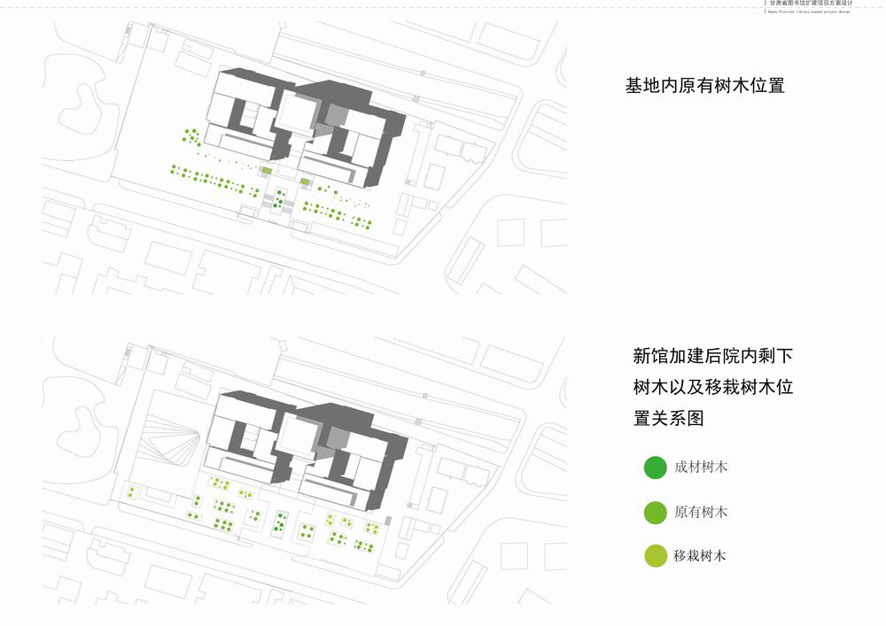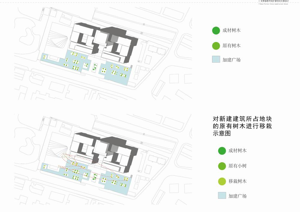四、广场改造:为了打造全民参与、开放的图书馆,我们建议最小工程量的改造广场,增加图书馆与道路的联系,引导道路和公园广场人流进入馆内。市民可以在广场上休息、交流、互动,图书馆广场不仅仅作为交通疏散空间,而是成为甘肃人民日常生活服务的市民广场。对于图书馆本身,我们也可以利用这个广场下面空间作为临时停车,解决地面临时停车问题,且也不会影响整个馆区的交通和视觉。改造广场我们遵循尽量不破坏原有绿化和交通便利的原则。