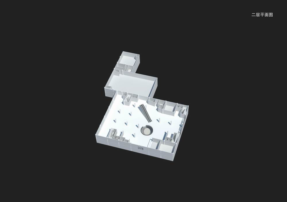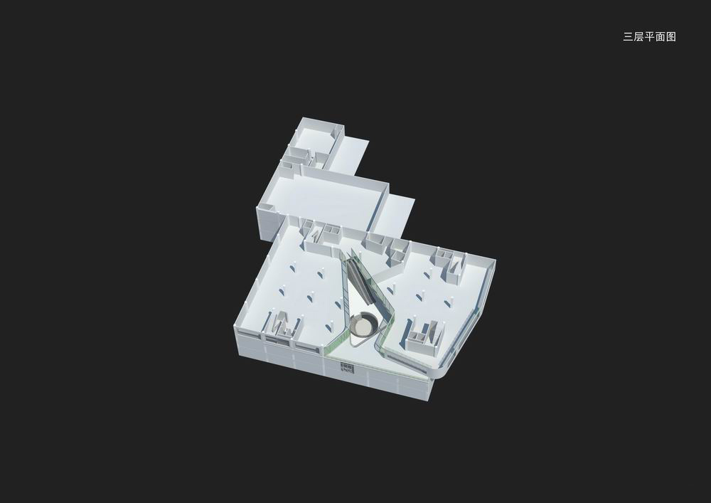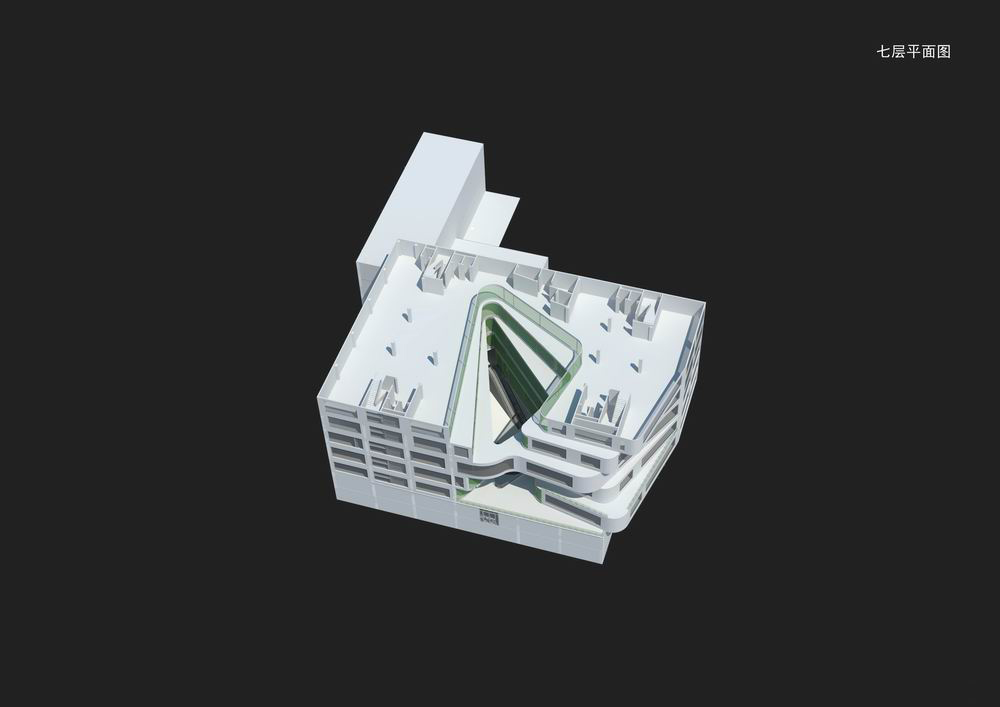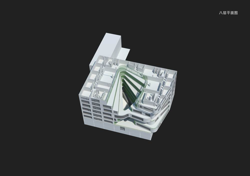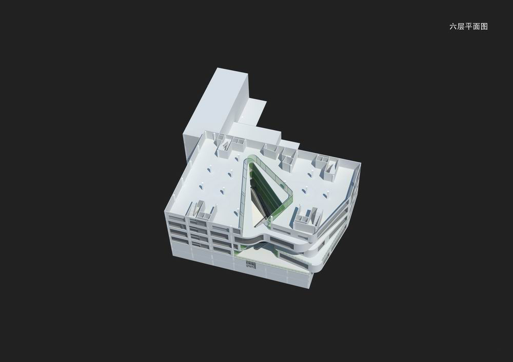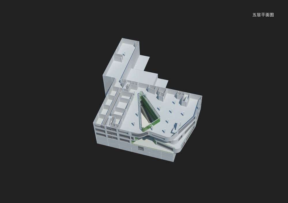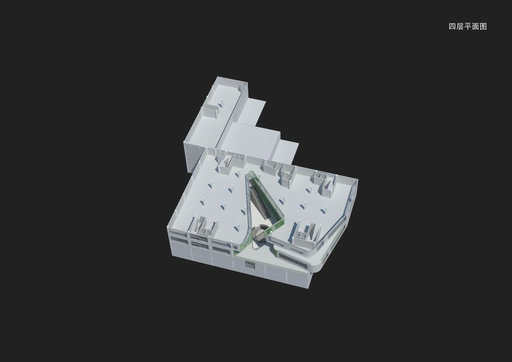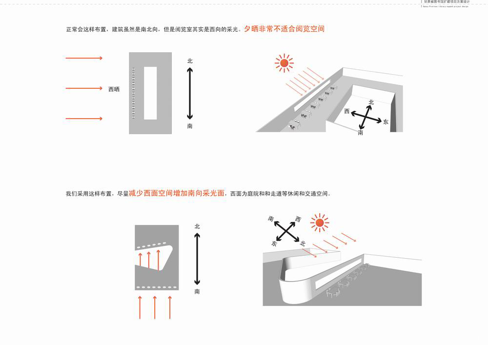三、庭院:读者在阅览室看书,他们需要单独的交流、休息、接电话等需求。我们在南楼和北楼连接处做了一个封闭退台组成的中庭。它既是交通空间,也是休息空间。基地南北向特别长,如果开正常长方形中庭采光,虽然建筑是南北向,但阅览室其实是西向的采光,西晒非常不适合阅览空间。我们采用接近三角形的中庭布置,化东西向为南北向,尽量减少西面面积增加南向采光面。让北楼有更长的南向采光空间。西面不利于阅读的空间作为庭院和走道等休闲和交通空间。