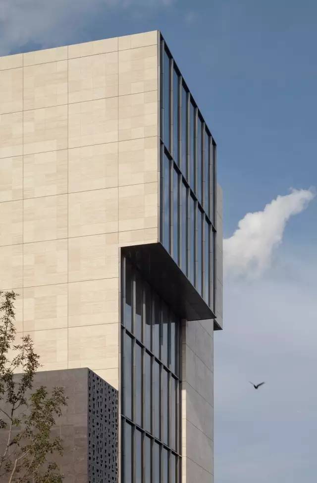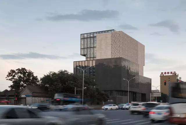 总图设计在北侧退让出30m范围的建控区,以园林景观设计营造出贴近文物建筑的高品质城市空间。建筑形体分为高度不同的若干小体块:12层主体建筑布置在用地南侧,和现状沿菜市口大街周边60m高的建筑群基本保持一致;北侧布置多层裙房,形成空间梯度高度递减至建控区。此举消解对城市历史街区的视觉压迫,同时形成丰富的建筑表情。建筑表皮设计着力于体现建筑与城市历史和文脉发展的关系,以超白玻璃反射天光云影和胡同院落,以传统纹样开洞的石材幕墙表皮暗合中国神韵。