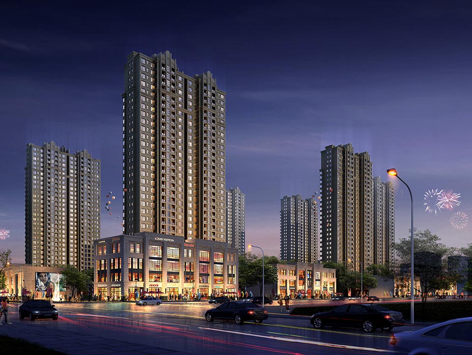 项目的地上规划建筑面积152179.16㎡,地下91024.75㎡,容积率1.999,保证了小区的整体绿化及居住品质。住宅楼均为高层,建筑面积1235.86.06㎡,其中保障房建筑面积14144.32㎡,立面均简洁大气,对称分布在以小区主入口、景观及建筑组成的中轴线两侧,形成围合、丰富的秩序空间。小区商业面积10717.58㎡,配套公建2167.96㎡。集中商业沿北侧的百川路展开,南北两侧皆有大尺度广场;项目东侧亦设有商业和幼托配套。这种中轴对称的围合式布局手法看似封闭内向,实则通过小区内外的交流互动,参与到城市的有机生长。在这里,空间没有被建筑所束缚,而是超越内与外的界限,自由地获取场所,实现建筑、城市与人的再思考。