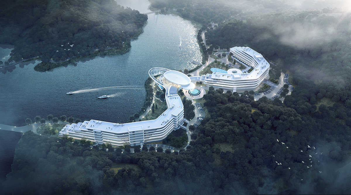 In the era of the Internet, the self media economy is booming, with internet celebrities bringing traffic and traffic creating customer sources. The overall hotel building is situated on the mountain, facing the water, with open wings that resemble the return of migratory birds, searching for habitats high in the mountains and far away in the water. The crystal clear hotel lobby is like water droplets on the lake, overlooking the invincible scenery around it.