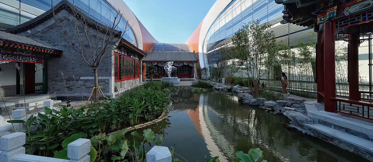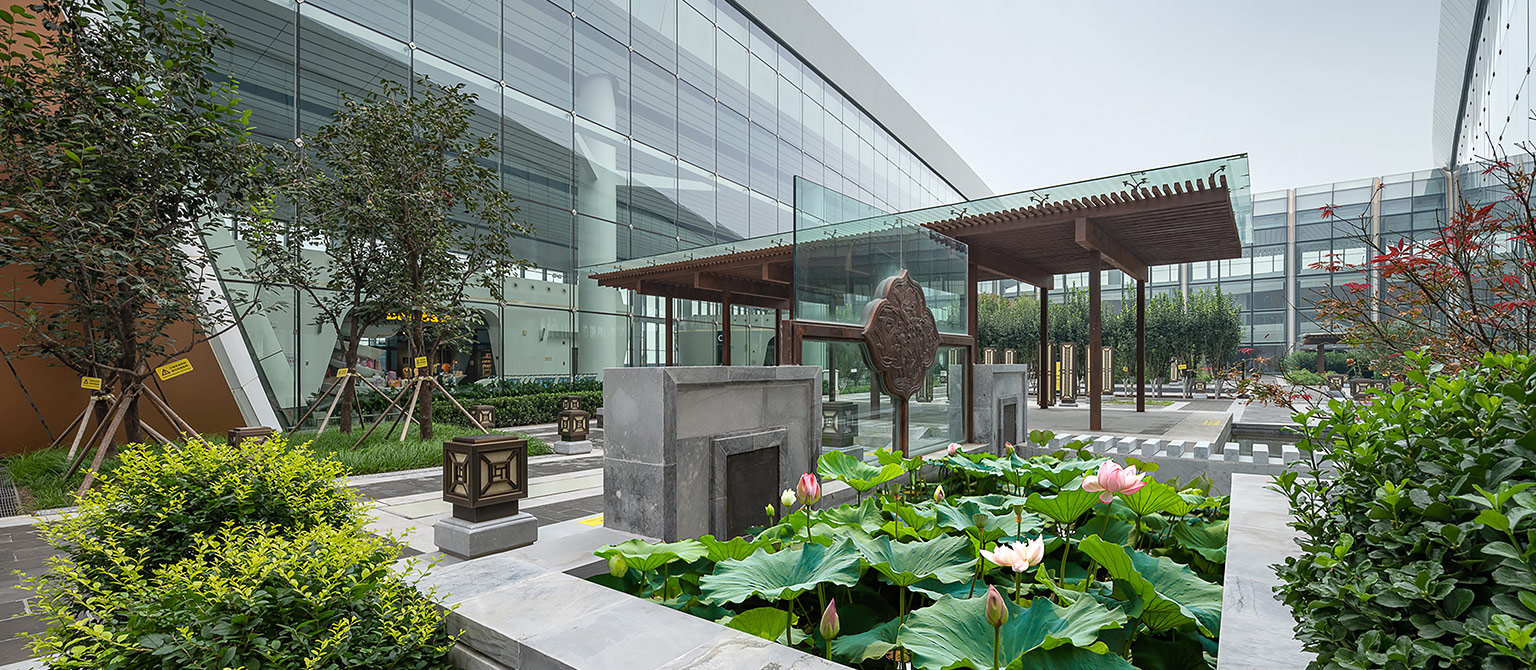 北京新机场指廊庭院分别位于航站楼五个指廊末端,面积各约2,000平米,为航站楼提供户外休憩及吸烟区。庭院景观设计以中国丝绸之路文化理念为基础,选取特色文化符号丝、茶、田、瓷文化主题赋予国内区4个庭院具有个性的现代手法表达;国际区指廊庭院定义为中国园,是向世界窗口输出的中国传统园林的形式。