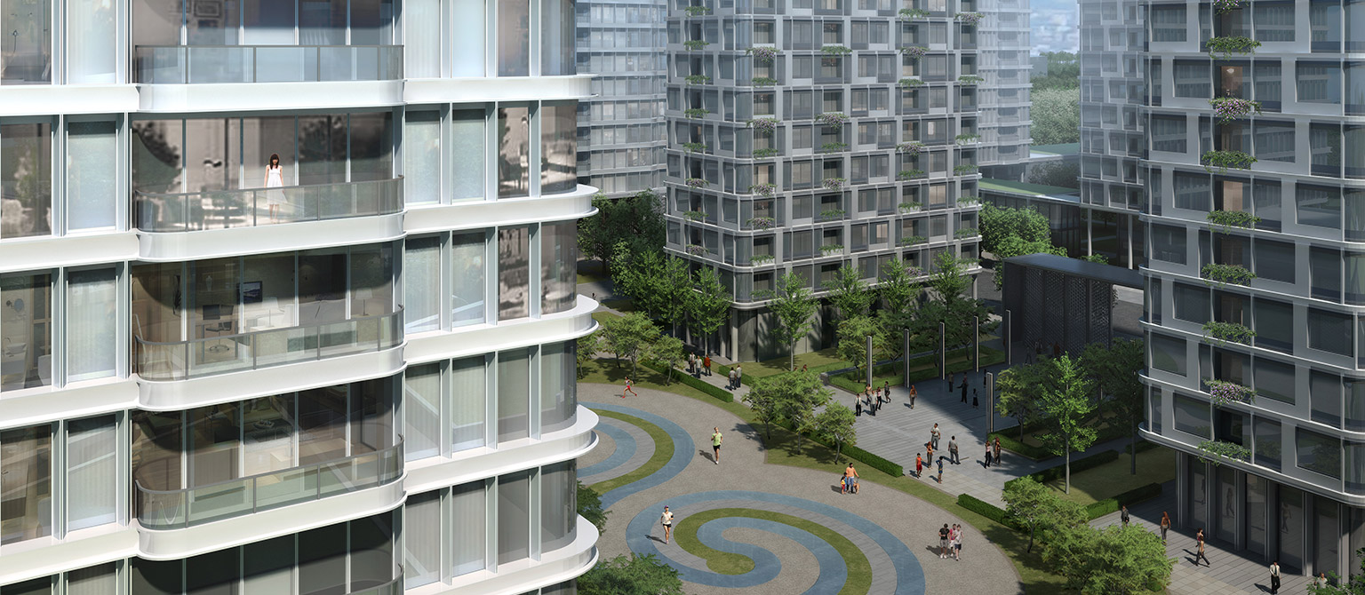 设计概念源自传统的院落形制,通过围合和开放的变化,形成私密与共享巧妙结合的院落居住空间。通过打造三轴,两环,多界面的丰富格局,呈现现代合院大气稳重的空间气质。利用立面的风格变化,将整个园区分为三种组团类型,其中中间四栋楼为一个组团类型,四栋楼外圈形成一个环装组团类型,其他角部为一种组团类型。中心绿地广场采用冰嬉图意向,在院落的核心空间打造适应多种运动的共享空间。每个地块的东西两侧建筑首层及二层局部架空,将城市空间引入本项目的公共空间,形成线性开放空间,为城市退让出一片活力共享空间。同时架空的住宅建筑更显轻盈。