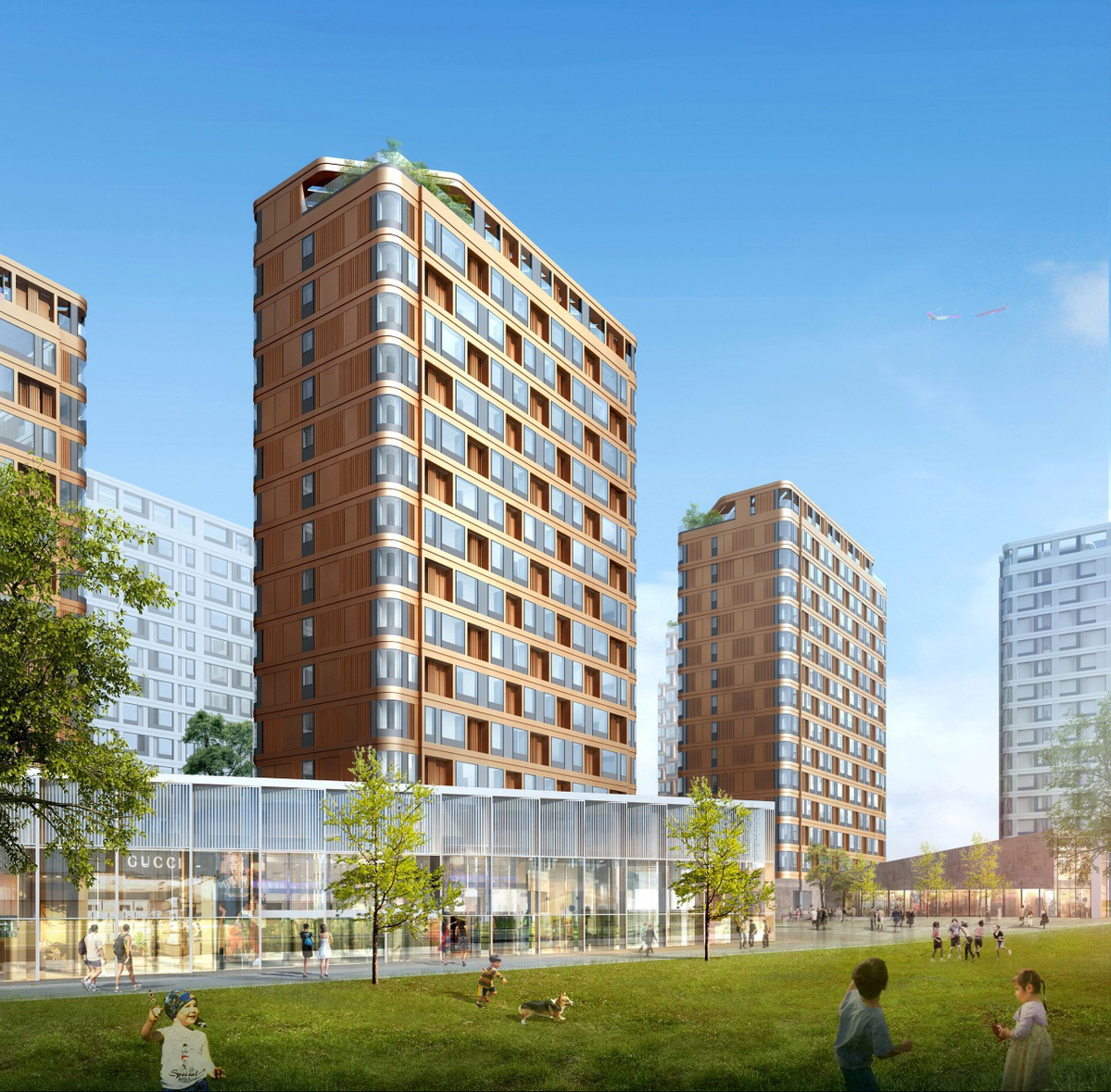 By utilizing the style changes of the facade, the entire park is divided into three types of clusters. The central green square adopts the traditional Chinese concept of ice playing, creating a shared space that adapts to various sports in the core space of the courtyard. The first and second floors of buildings on both sides of each plot are partially elevated, introducing urban space into the public space of this project, forming a linear open space and giving way to a vibrant shared space for the city.