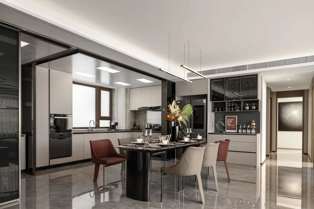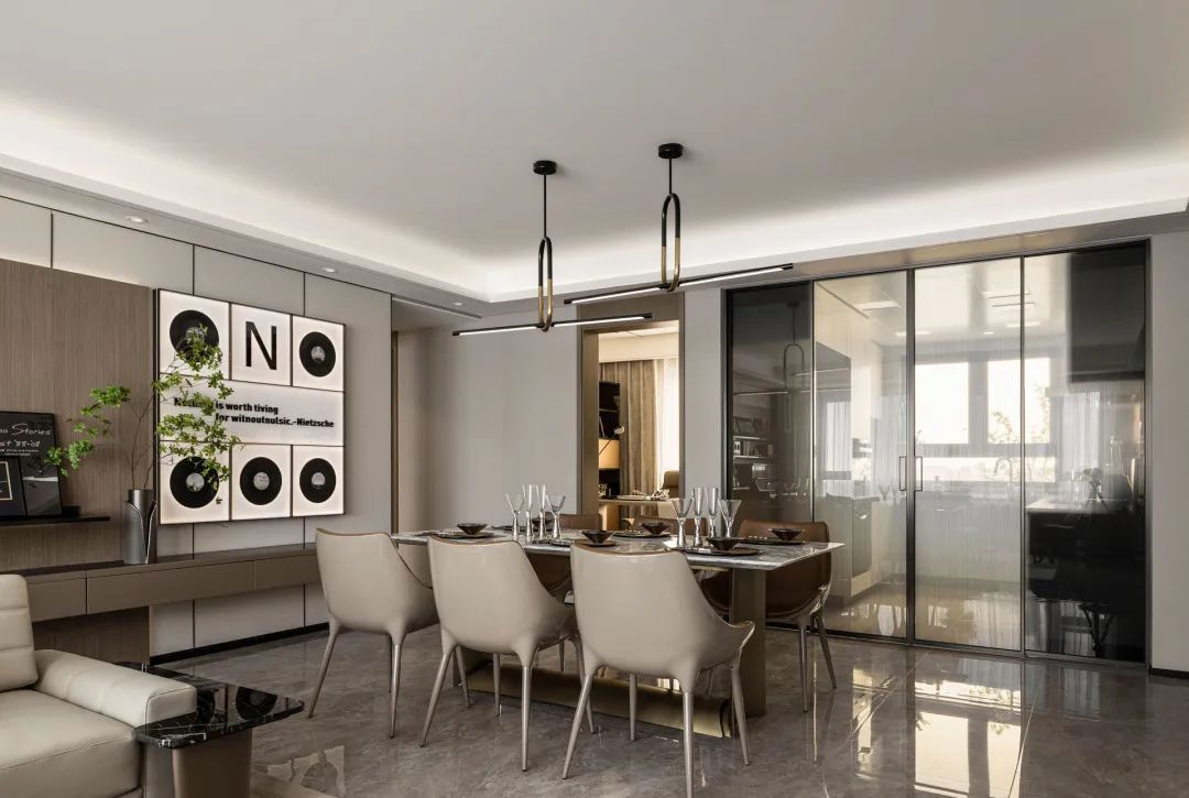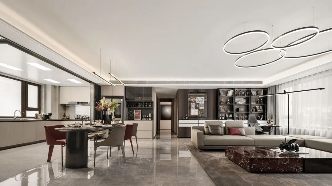 The restaurant and living room are linked in the same space, greatly improving the transparency of the space. The marble floor tiles showcase their quality, and under the refraction of light, they appear even more charming and profound.