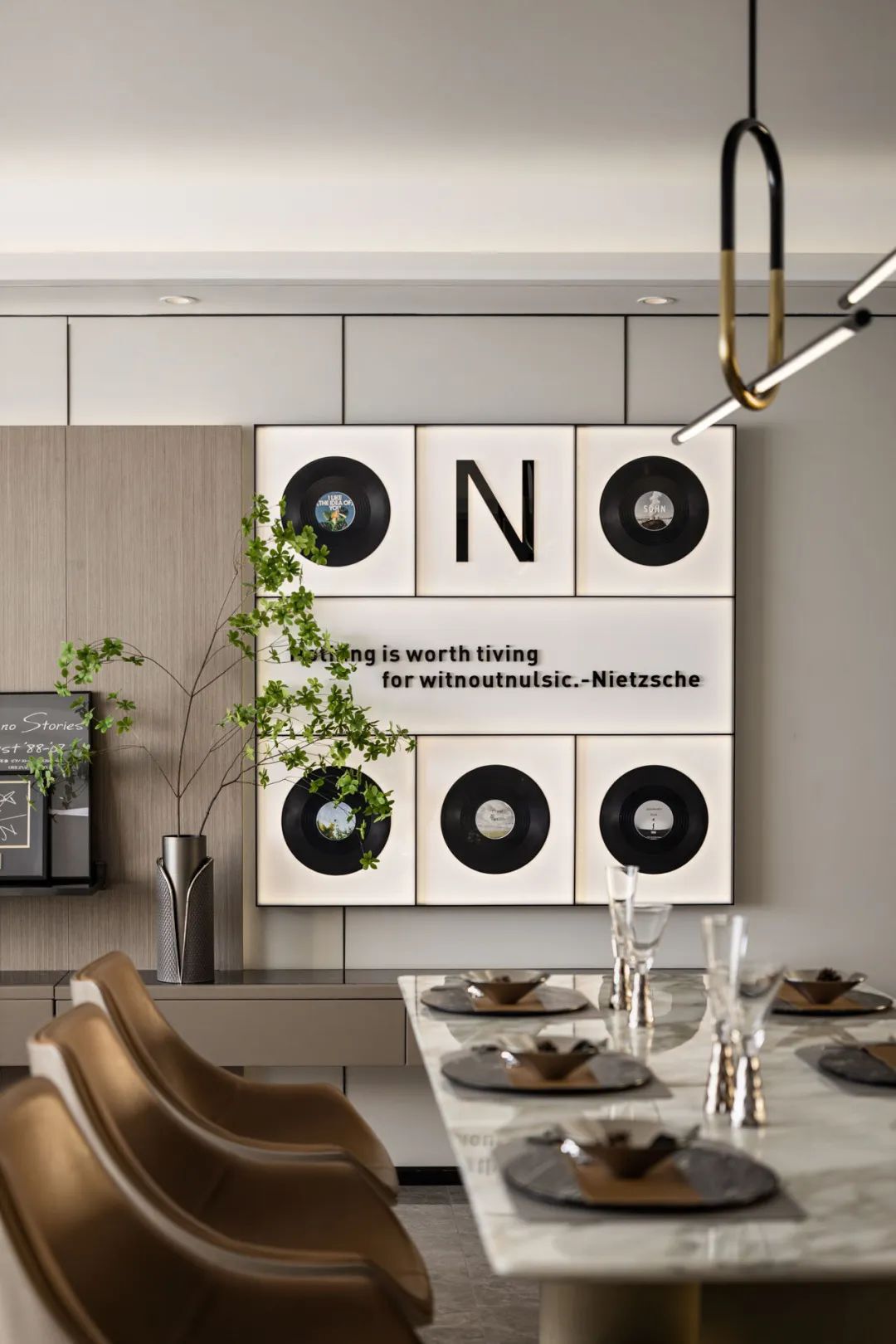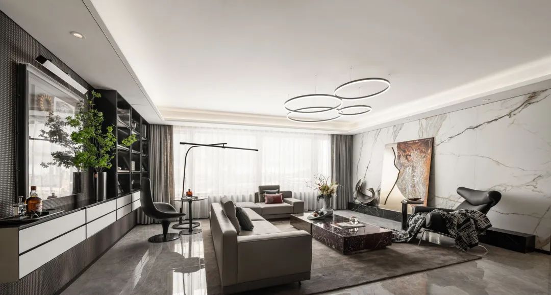 本案以“乐享盛宴 飞驰人生”为设计主题,将音乐里的时光回忆串联成生活里的一个个篇章,嵌入到设计场景中,结合收纳、收藏、演奏、观影等生活需求,演绎家的音乐精神,构建现代都市生活理想居所。