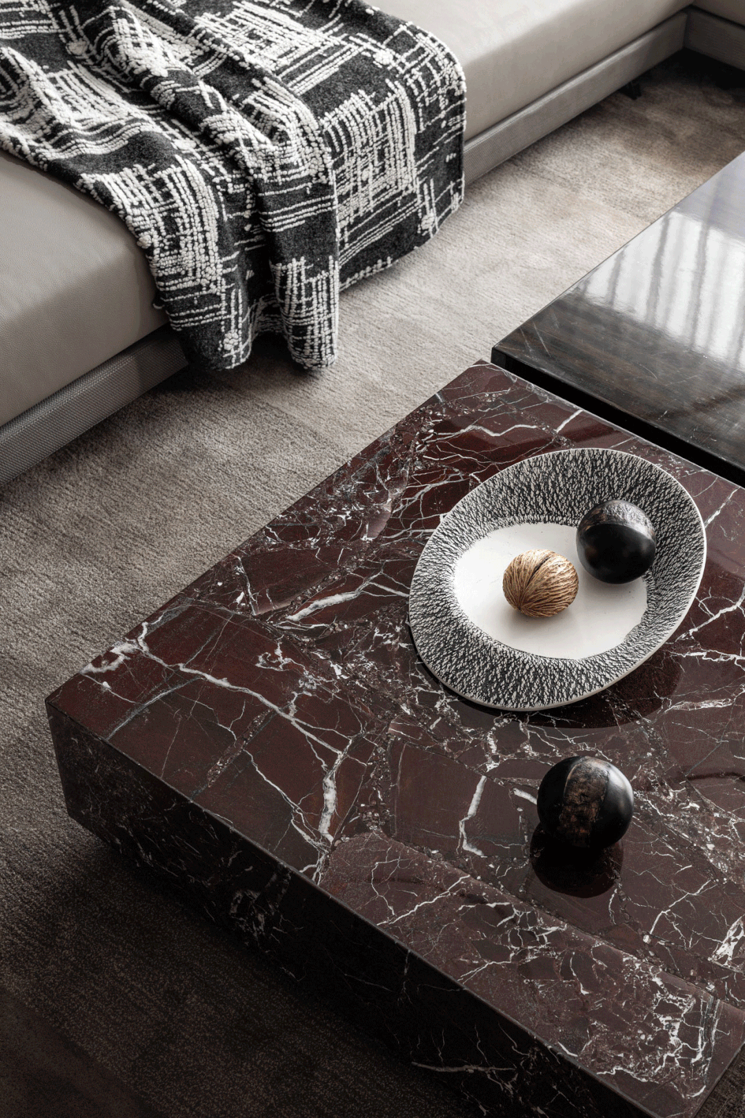 The combination and collision of colors match the elegant aesthetic temperament, and the delicate texture of materials is a reflection of home quality. The surface of the red marble flows freely with textures, presenting a natural beauty that brings endless imagination and endows the space with unique romance.