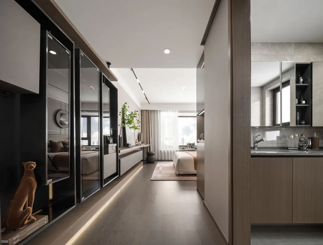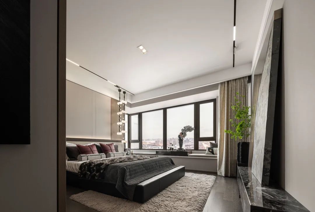 Throughout the entire space, individuality is highlighted in the bedroom, and the design without main lights makes the space conform to the simple and fast lifestyle of elites. And in terms of spatial functions, it also incorporates personal fun choices, whether it is the art sculpture on the bay window or the expression of coffee scenes, all emphasizing the personal style of embracing oneself.