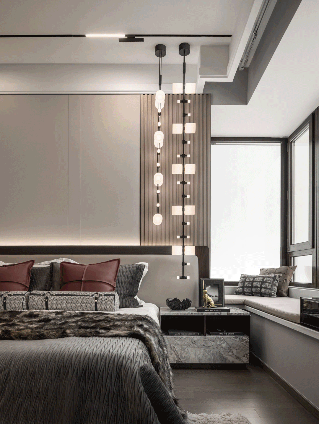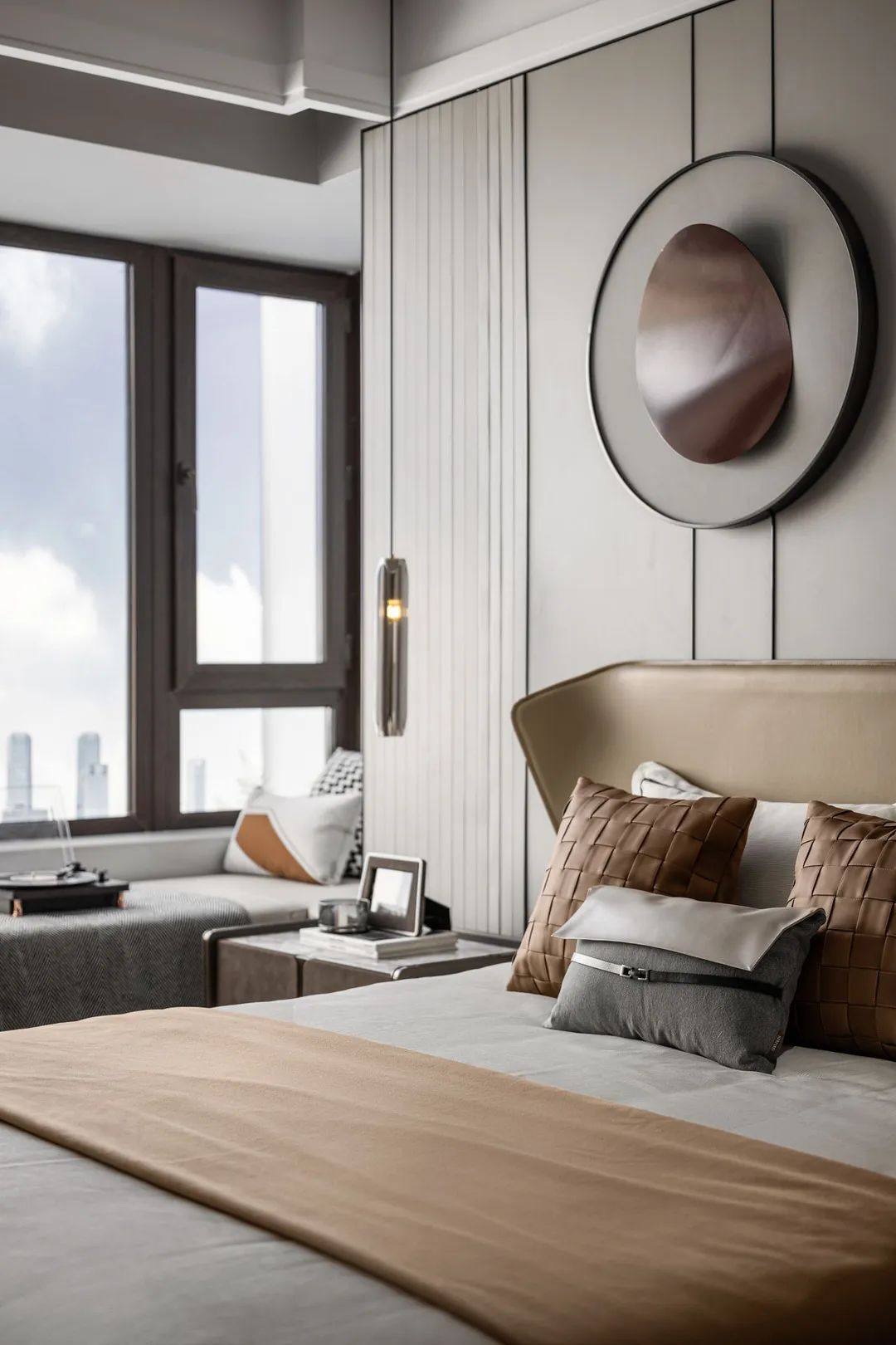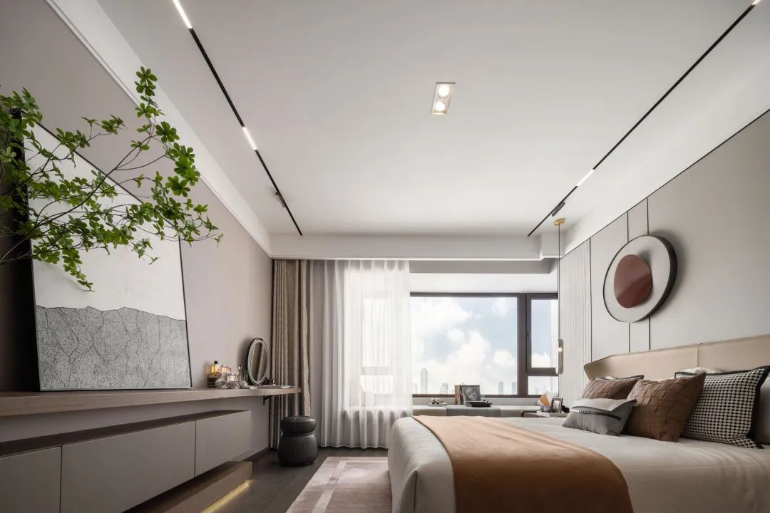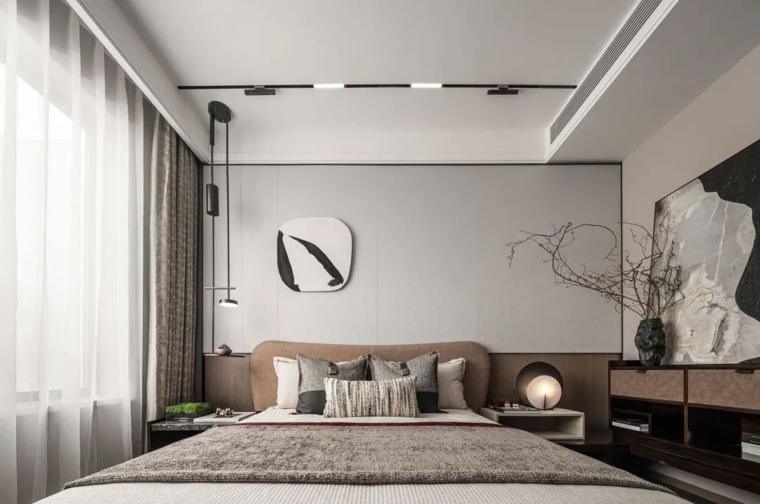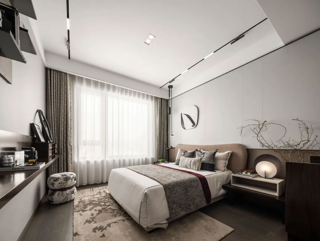 主卧围绕不同需求展开设计,在稳重与轻松之间取得平衡,色彩既不单调也不强烈,各种材质的融合与交错带来的视觉体验。