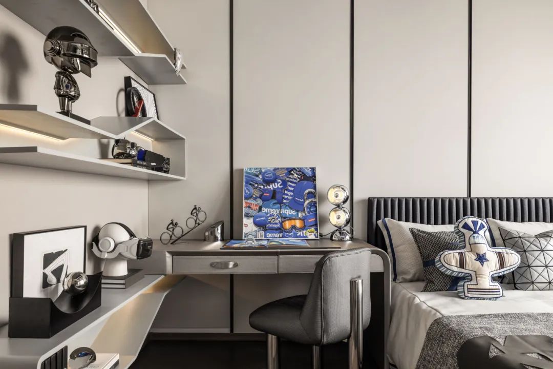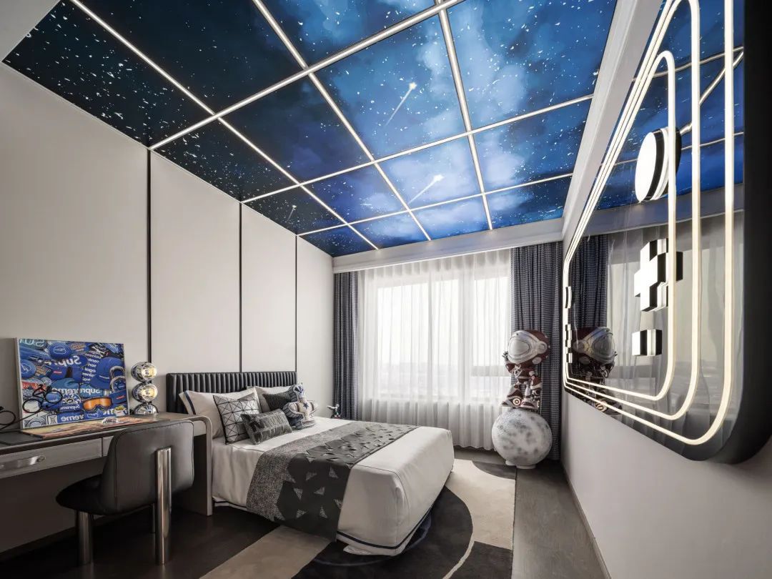 In his childhood, the boy always had an inconsiderate dream, which was reflected in the night sky, hidden in the Milky Way, twined on the planetary ring, and hid on the far side of the Moon to smile. This is the source of inspiration, filled with youthful dreams, and the addition of blue makes the boy's room more vibrant. In the sensory aspect of space, every small detail reveals a love and exploration for space.