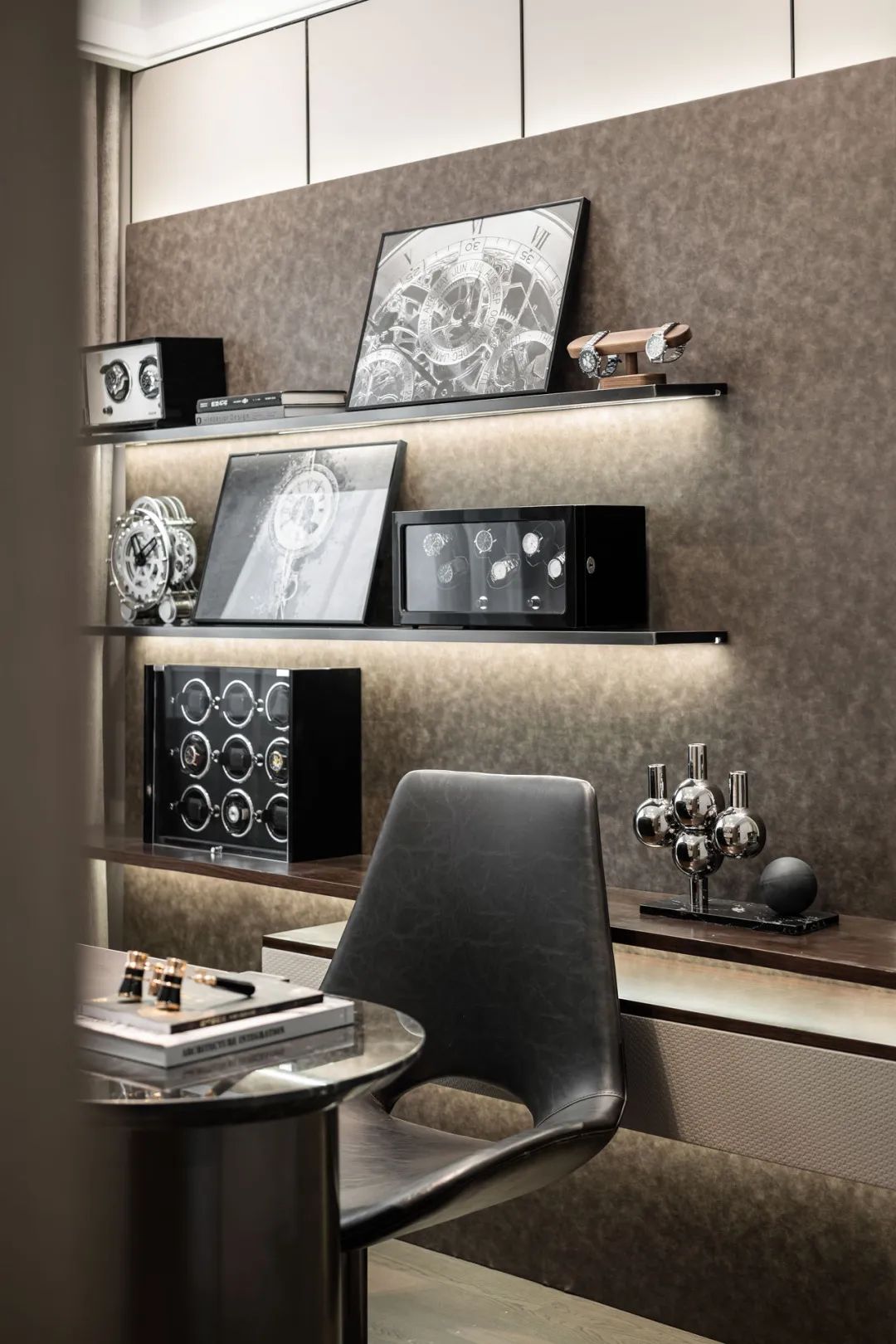 书房雅与奢并重,精装与品质并存。巧妙运用汽车及钟表道具,影射出书房主题,每每步入书房都会引起强烈的情感共振。