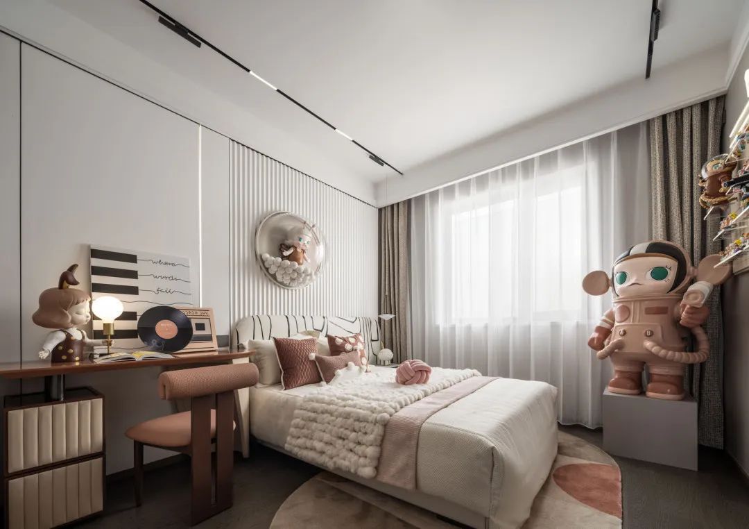 The children's room is themed with Bubble Mart, featuring warm oranges jumping in elegant colors, disorderly abstract lines, exquisite leather chairs, hanging bedside glass lighting, and exquisite bed screen colors that complement each other. In a harmonious combination of fine aesthetics, it creates a graceful and dynamic life meaning, showcasing children's fun.