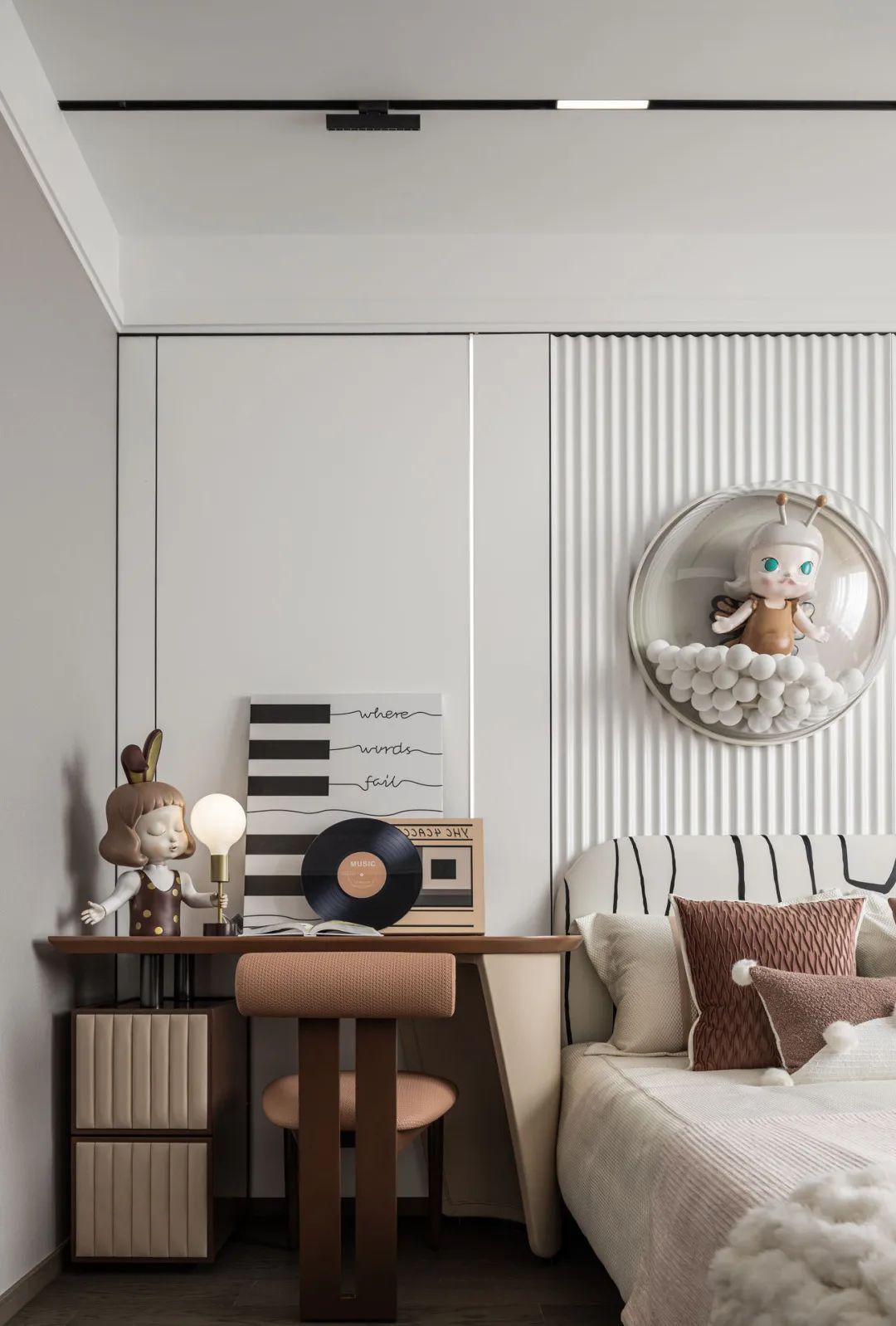 儿童房以泡泡玛特为主题,简雅色彩中跳跃的暖橙、杂乱无章的抽象线条、工艺精致的皮革椅子、垂坠的床头玻璃灯饰与精尚的床屏设色互映,在细美感的和谐合间,令曼妙灵动的生活意蕴,展示出孩童的乐趣。