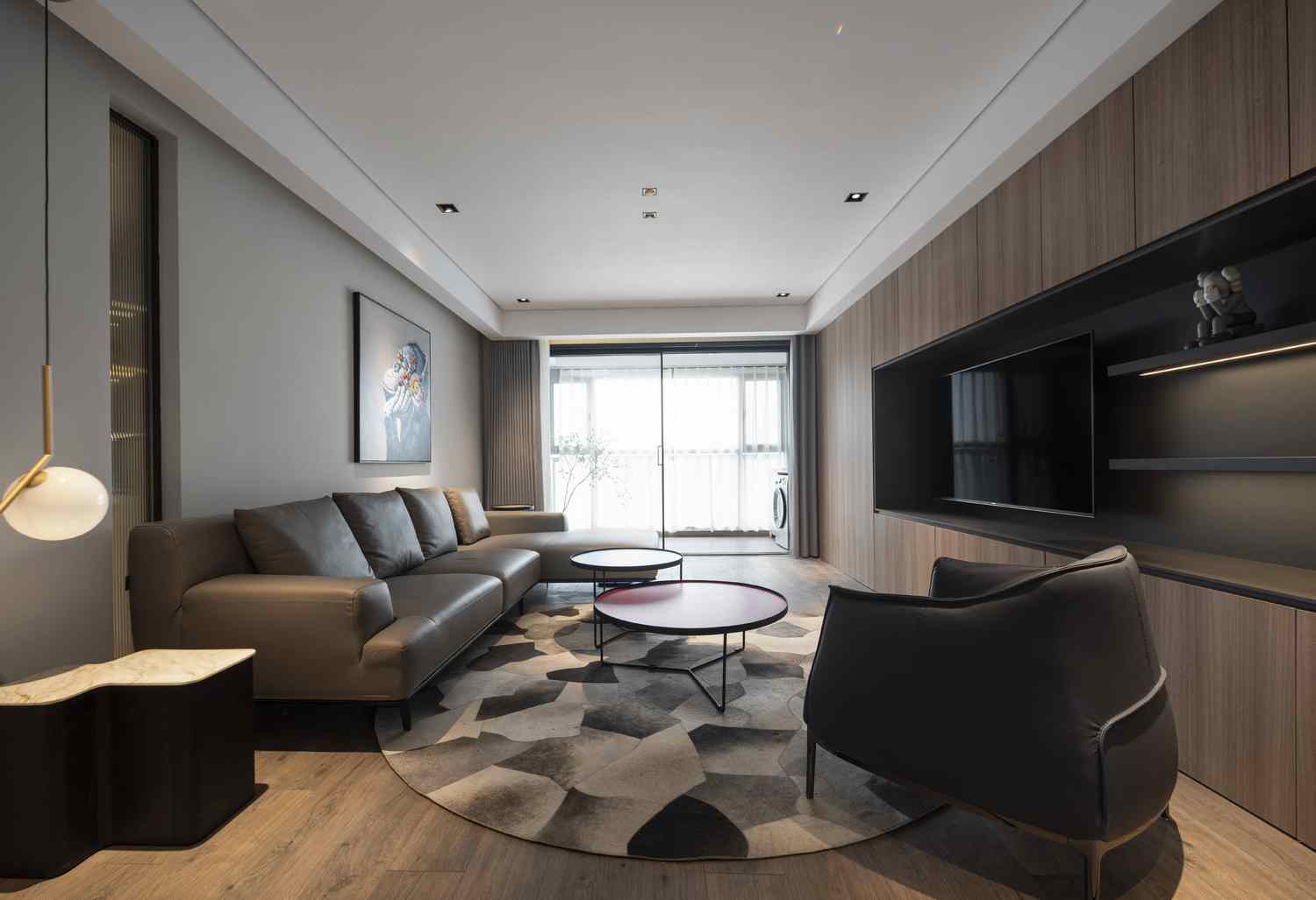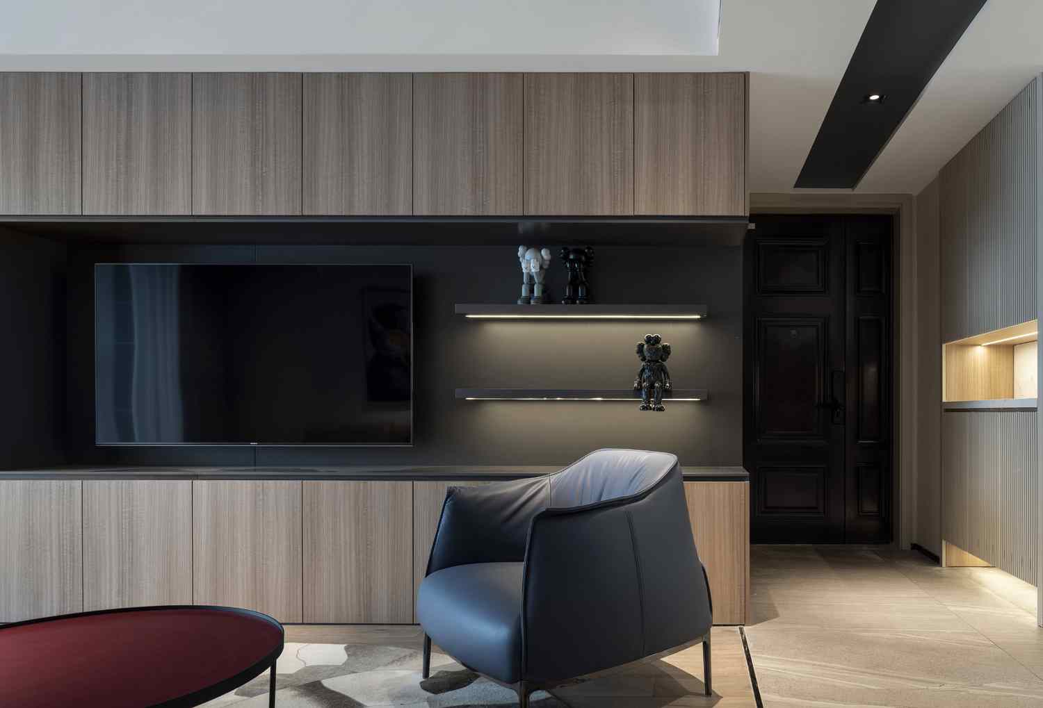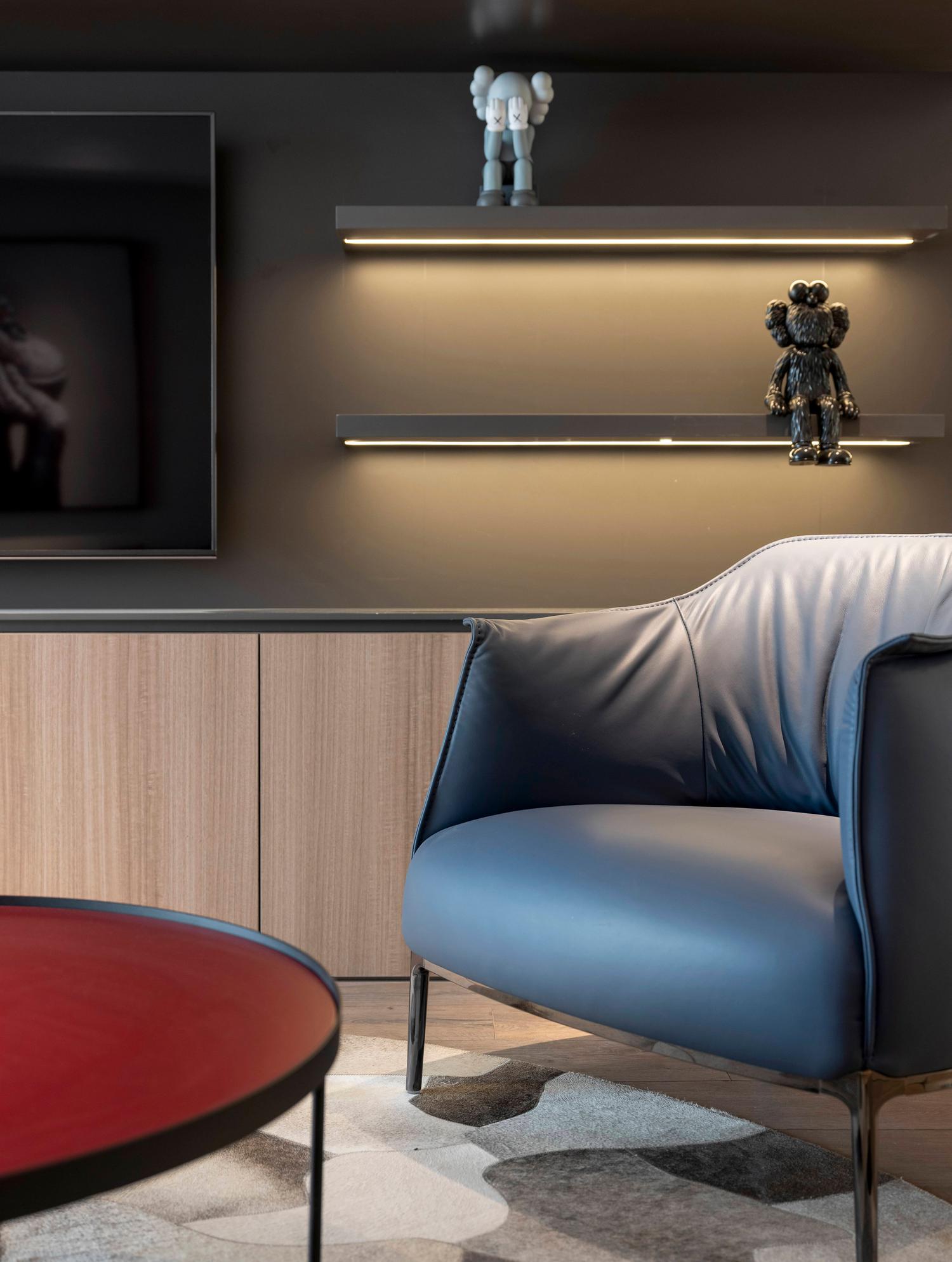 整个家的氛围上,这与在顶面、墙面各个地方点缀的线性灯光起到了很大的作用,在黑白灰色为主的空间中,暖色的灯光为之添加了一些温暖。