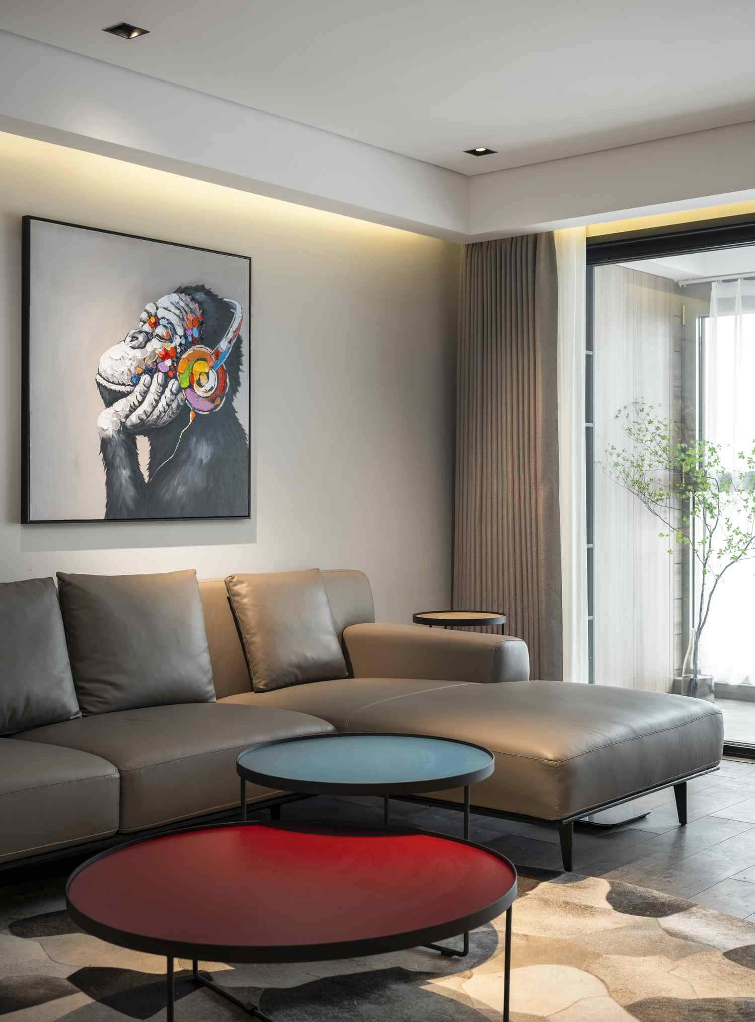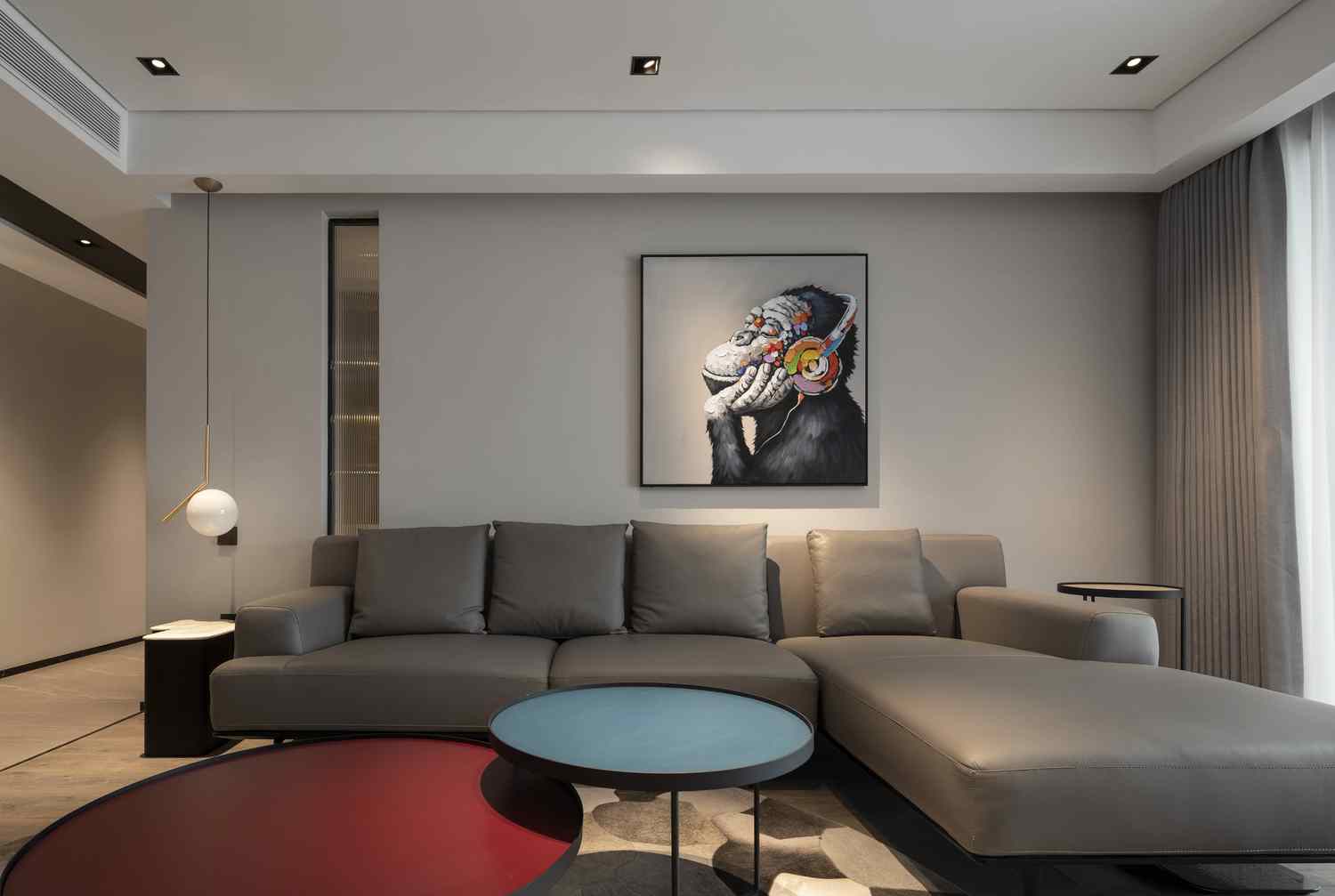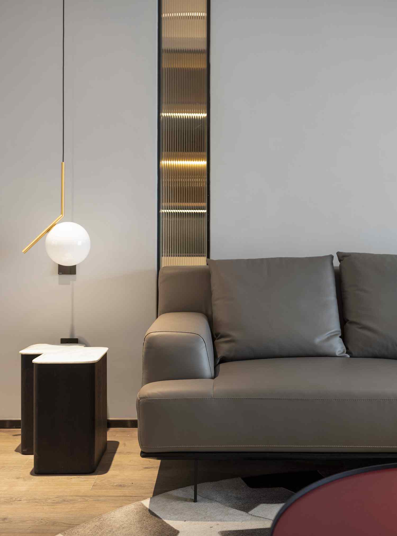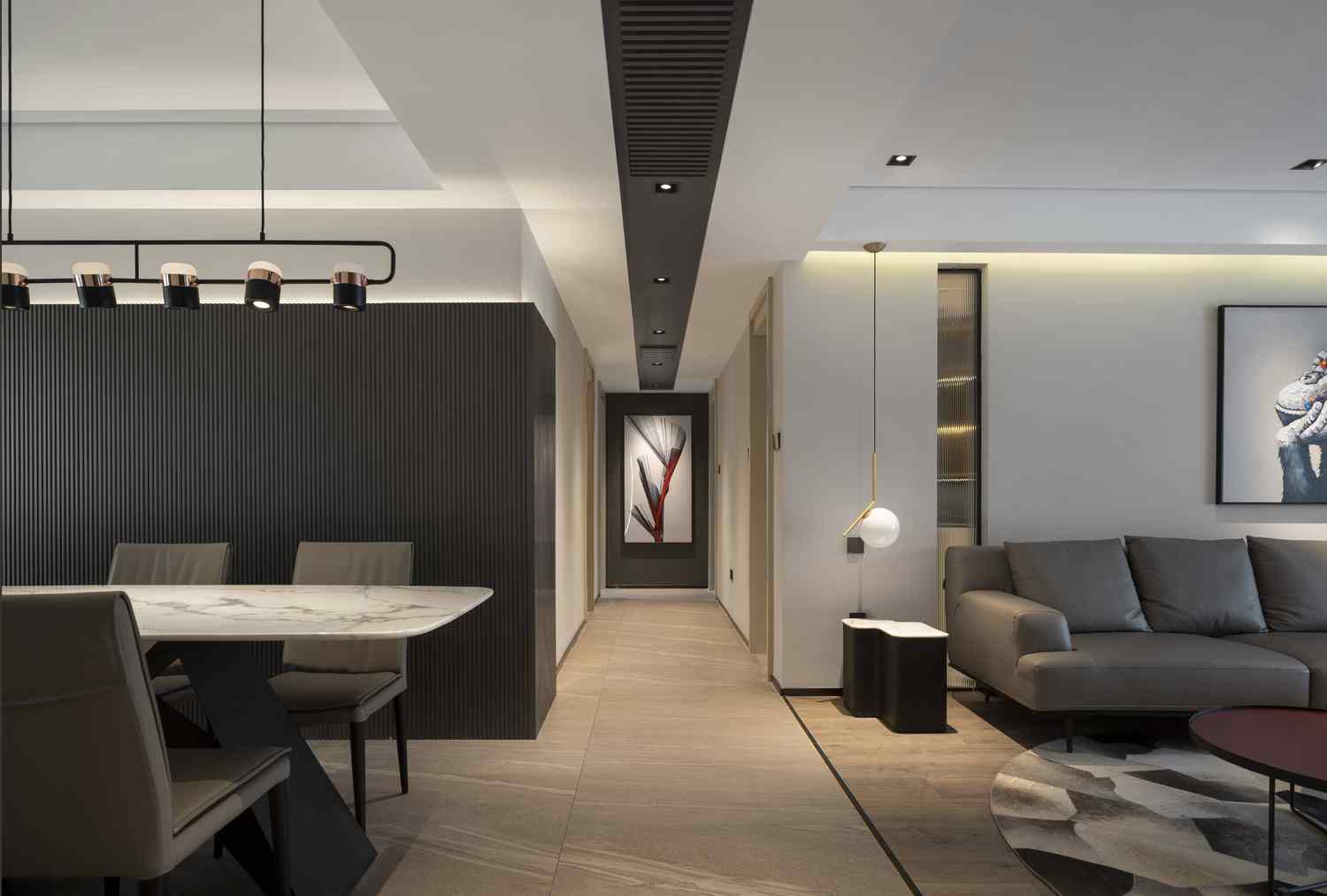 整个家的氛围上,这与在顶面、墙面各个地方点缀的线性灯光起到了很大的作用,在黑白灰色为主的空间中,暖色的灯光为之添加了一些温暖。