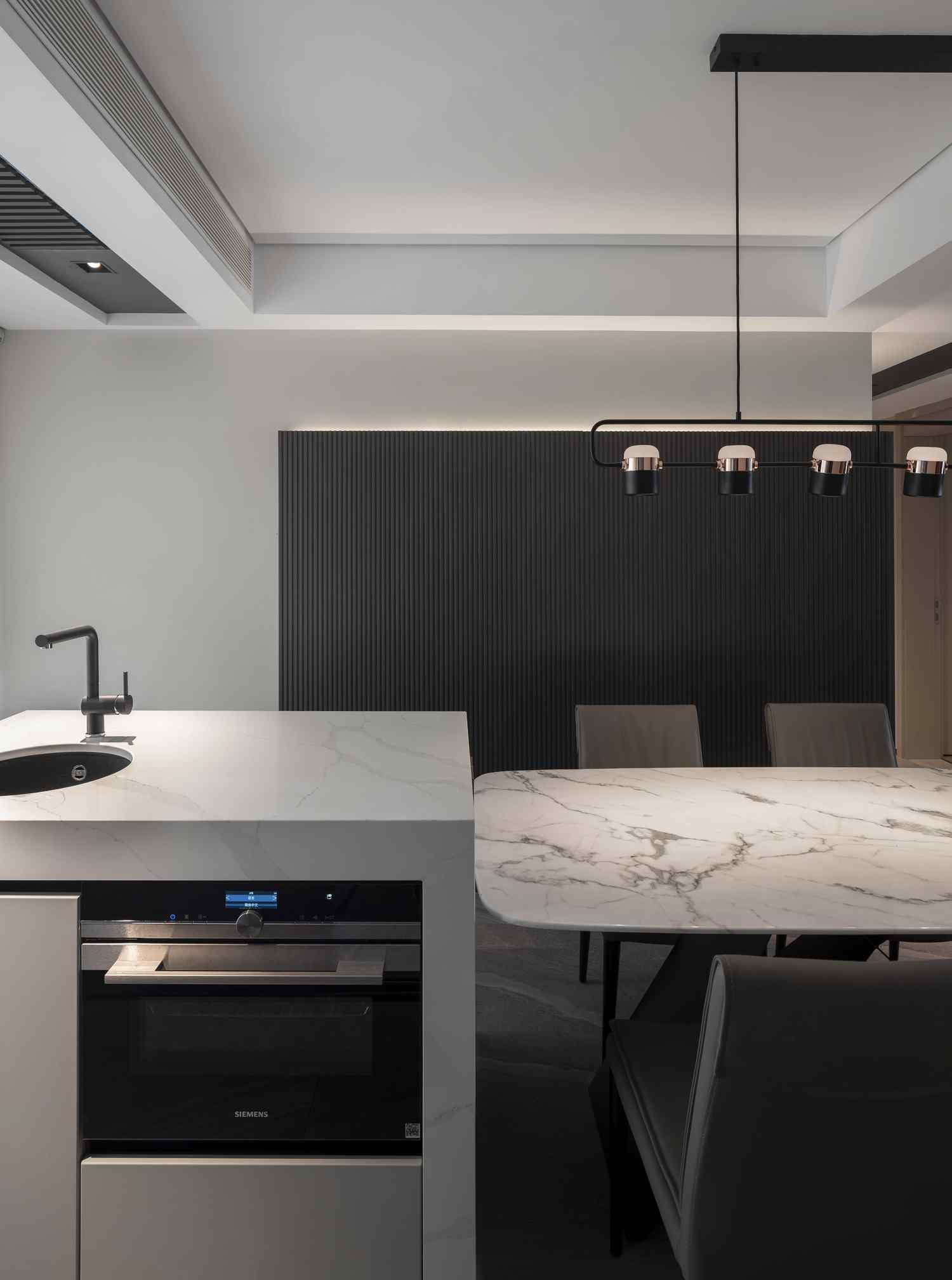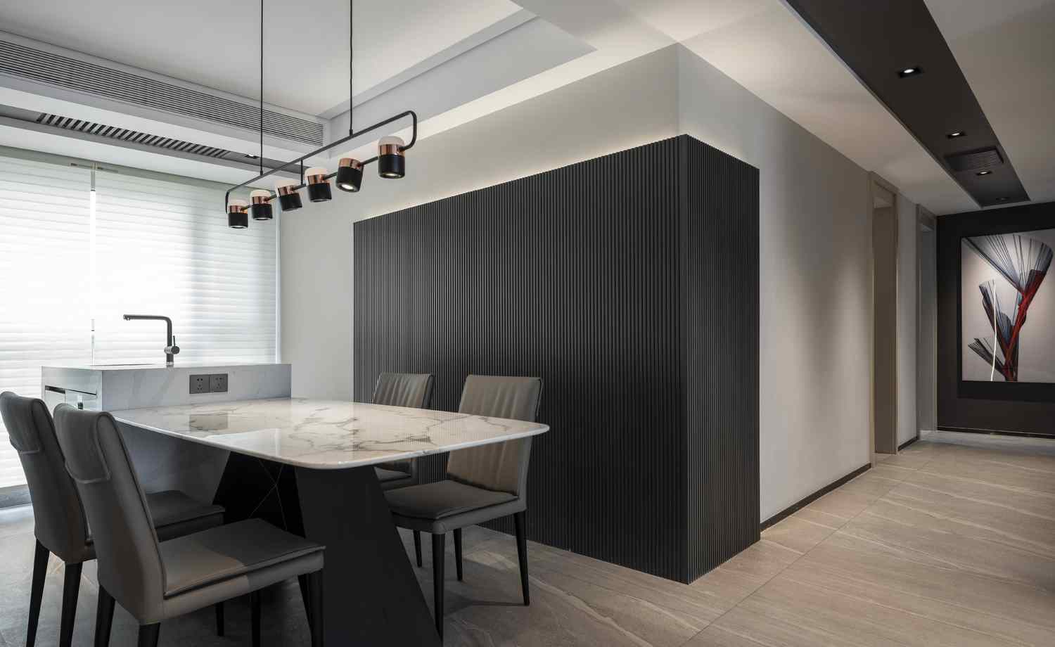 In terms of the atmosphere of the whole home, this has played a great role with the linear lights dotted on the top and walls. In the space dominated by black and white and gray, warm lights add some warmth to it.