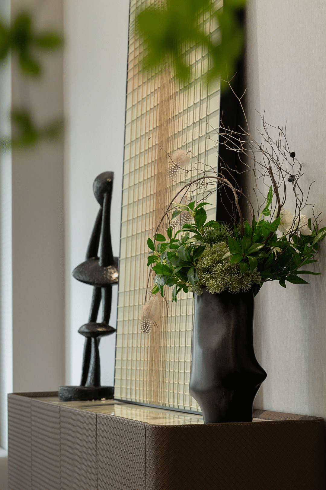 The low and flat terrain and plains create a gentle and gentle atmosphere in Suzhou; The Millennium Canal passes through the city, creating the brilliance and prosperity of Suzhou. The main colors of the entrance are noble black, elegant rice, and calm brown. Through clever arrangement and stacking, it creates an elegant and unique atmosphere in the space. A touch of green adds a more dynamic temperament, allowing residents to instantly relax from nature and nature upon arrival at home.
