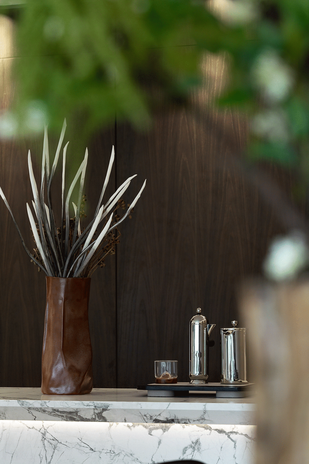 “暗淡轻黄体性柔,情疏迹远只香留。”空间之精神,格于物达于心,有其独特风韵。皮革雕刻的桂花于高尚中勾勒雅趣,书写着主人君子般文雅柔和、情怀疏淡的德行秉性。