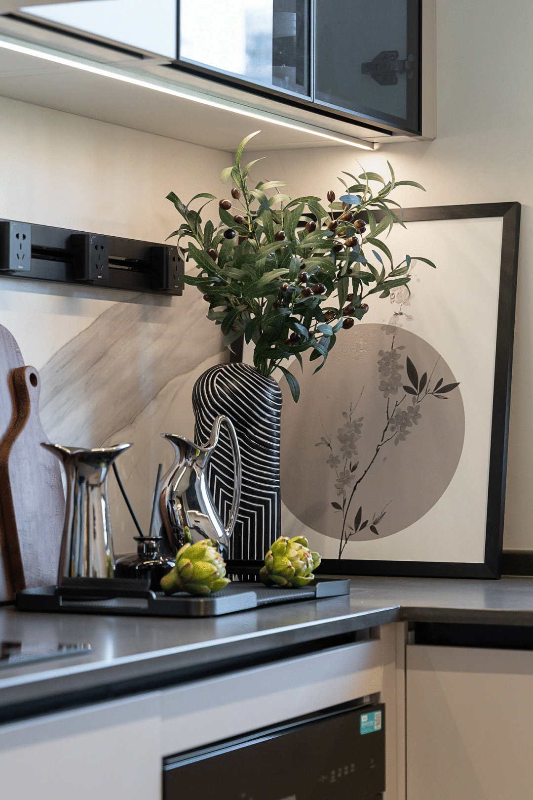 The kitchen utensils are hidden in the cabinet, and only a few items are displayed on the countertop, which not only keeps the space clean and tidy, but also achieves the unity of functionality and artistry in the kitchen space. The smoke curls up from the kitchen, and it cannot be separated from the participation of water, exploring the rhythm of life in the flow of water.