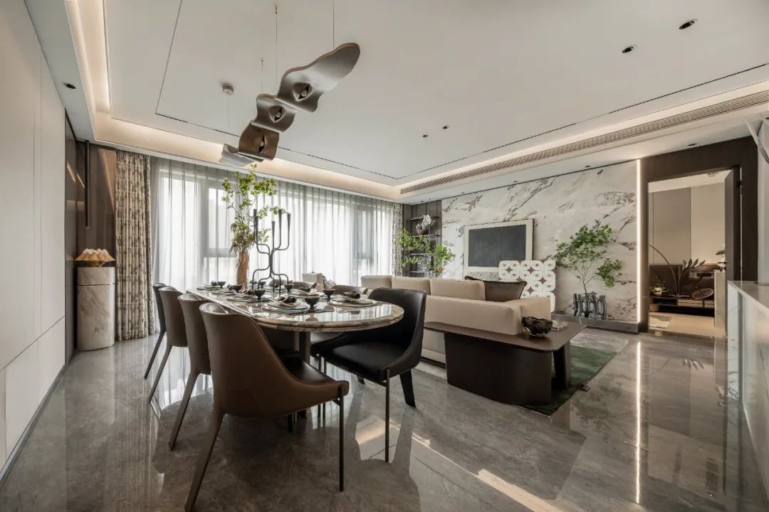 The dining room and living room continue to connect, with light and air freely passing through and flowing, increasing the intimacy between people and space. Not only can it satisfy the desire for food and drink, but it can also achieve communication and exchange of intimate relationships within the family.