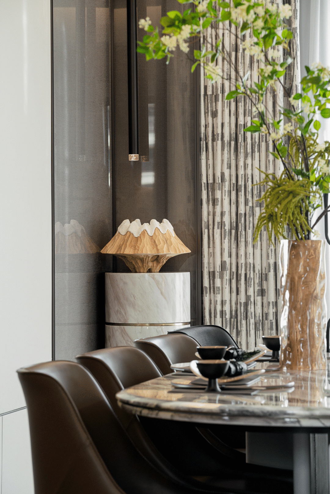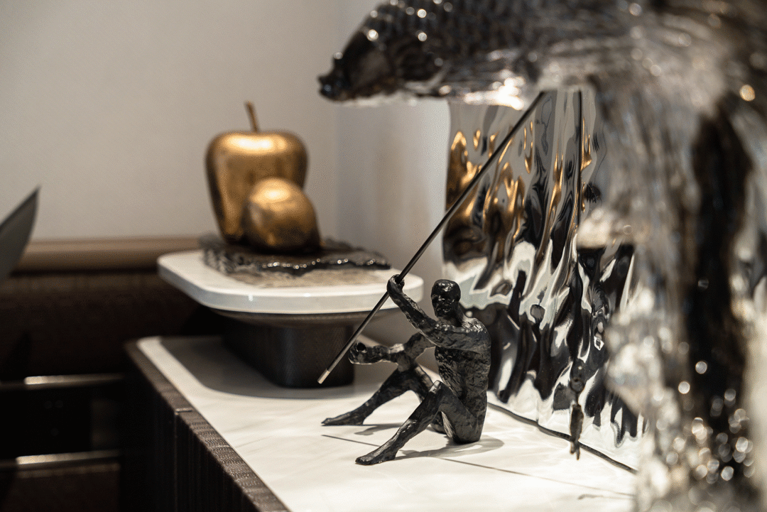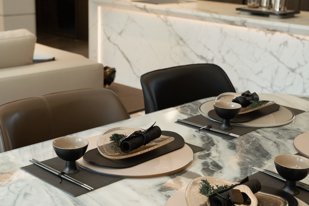 The mountains and rivers are picturesque, and it is not enough to inherit craftsmanship and ingenuity without "weaving". Natural stone inspired by natural landscapes, such as snowy peaks, exudes both a rustic beauty and a sense of freedom. Ceramic tiles, metal, leather, wired glass Different textures fill the space, enriching the visual hierarchy while showcasing the co creation space of life and art. It also has the emotional communication and entertainment functions of family members, endowing the living room with diverse and inclusive emotions, highlighting the people-oriented, dignified and stable temperament of the entire space.