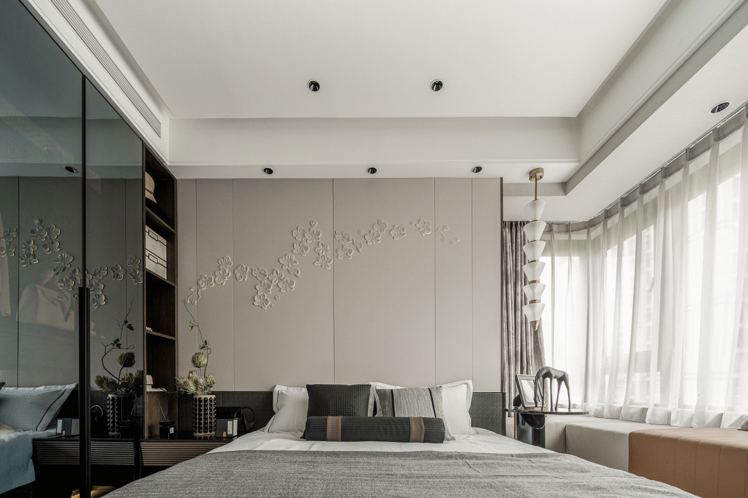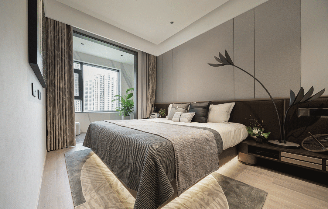 The exquisite decorations at the bedside add an artistic atmosphere to the master bedroom, bringing spontaneous refinement to the space, and the tea set at the windowsill reduces the oppression brought by black. In leisure time, enjoy tea in the sunshine, feel the different temperatures of life with various postures, and enjoy the colorful life.