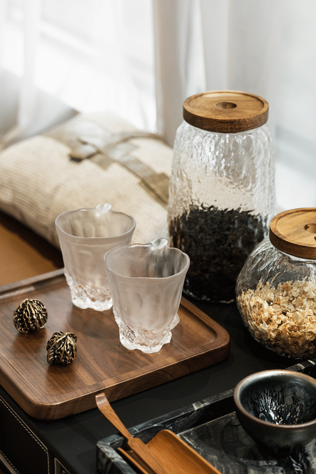 床头的精致摆件为主卧增添艺术气息,给空间带来自发的精致,窗台的茶具减淡了黑色带来的压抑。闲暇时间在阳光下品茗,用多种姿态感受生活的不同温度,享受生活的多姿多彩。